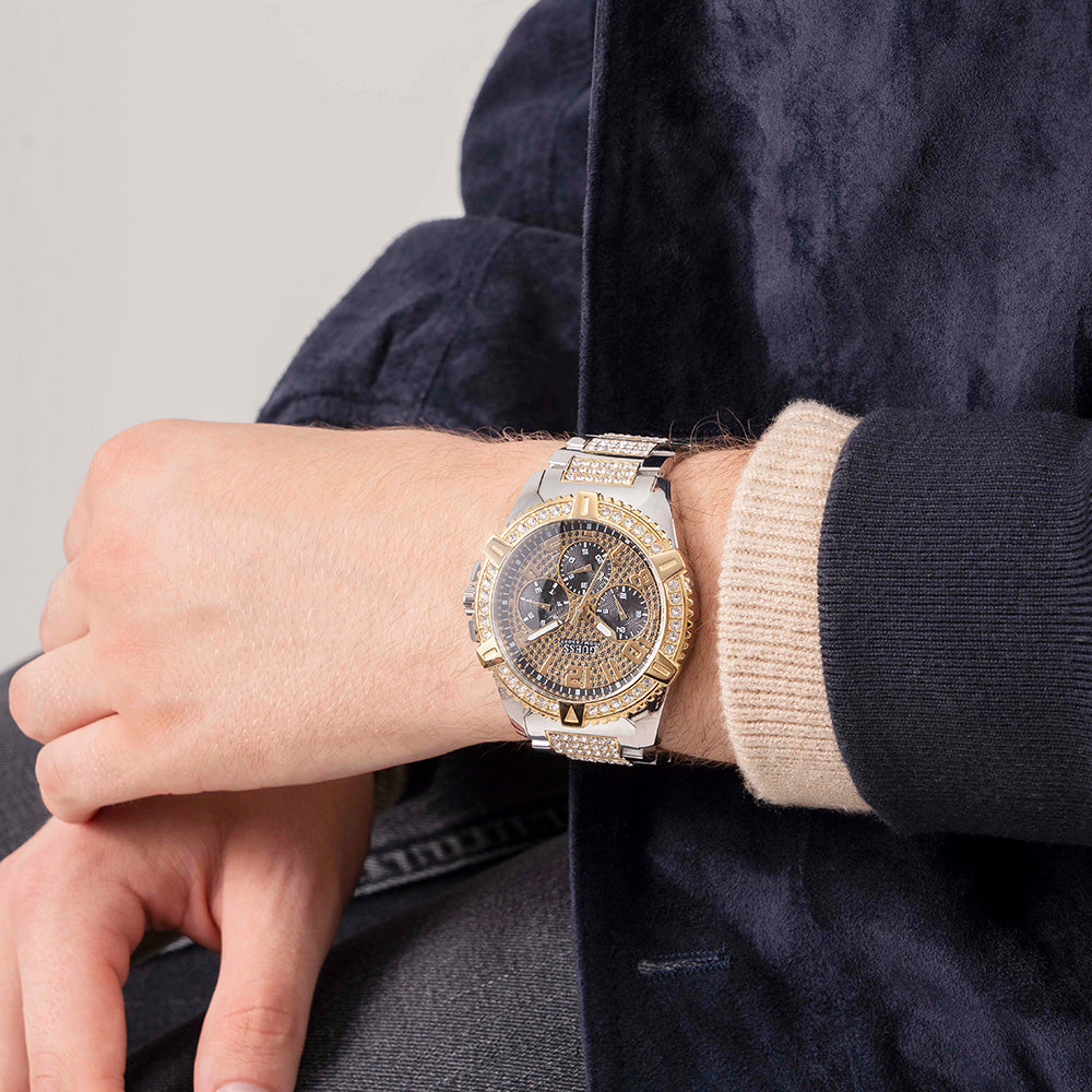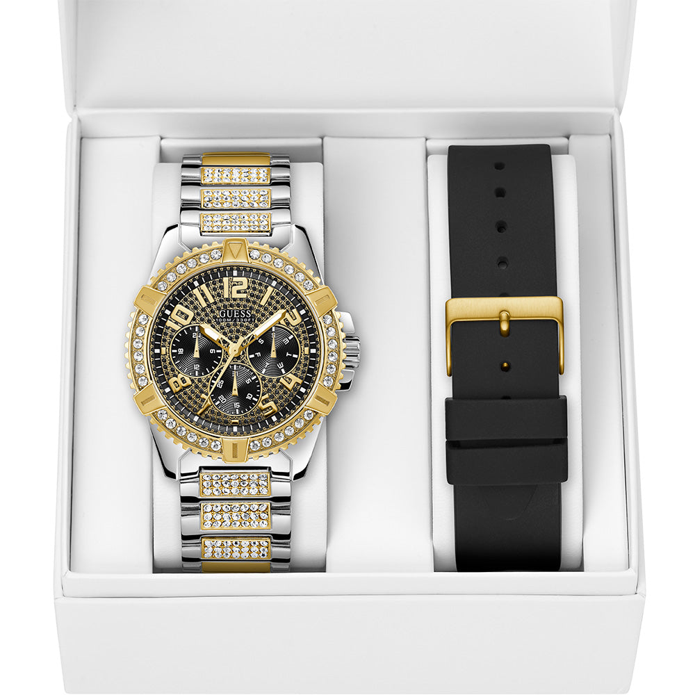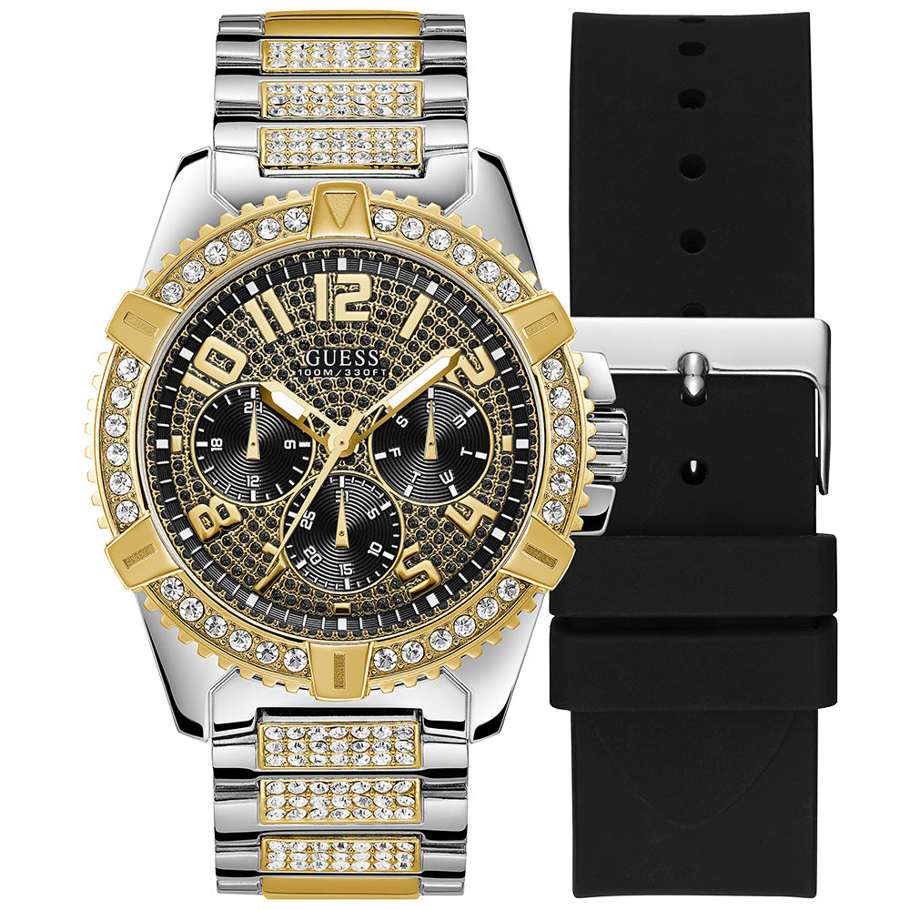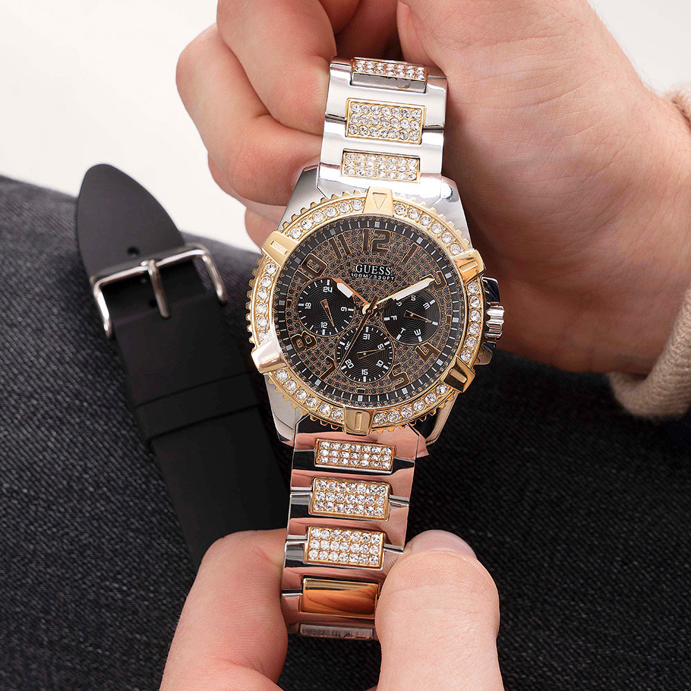 A beautifully designed gents watch; the Guess Frontier watch is the perfect accessory for every man. Made from stainless steel materials, the two-tone case and bracelet elevates the look. Designed with a black glitz dial the watch is sure to stand out. This also comes with an interchangeable silicone strap, if you should ever choose to change it up the option is there.