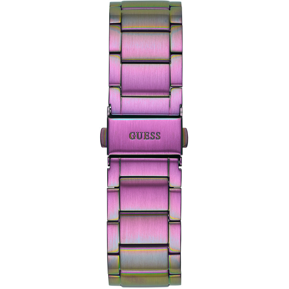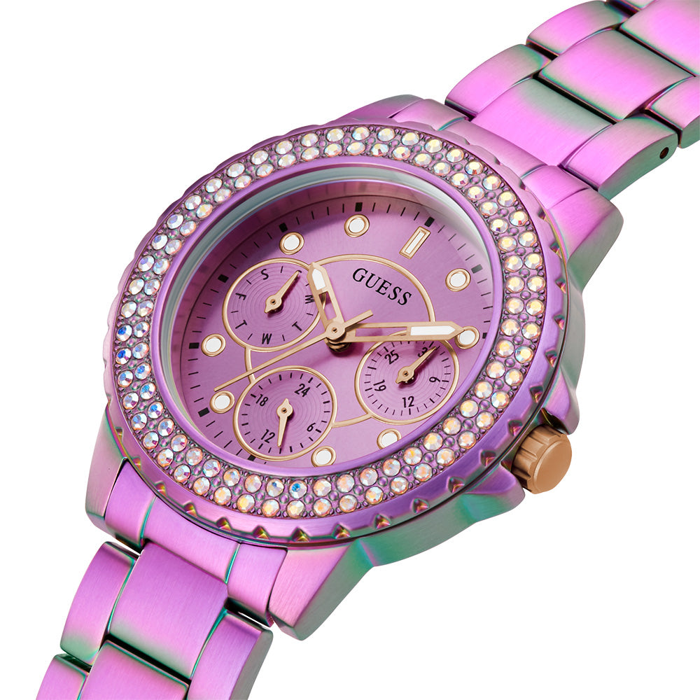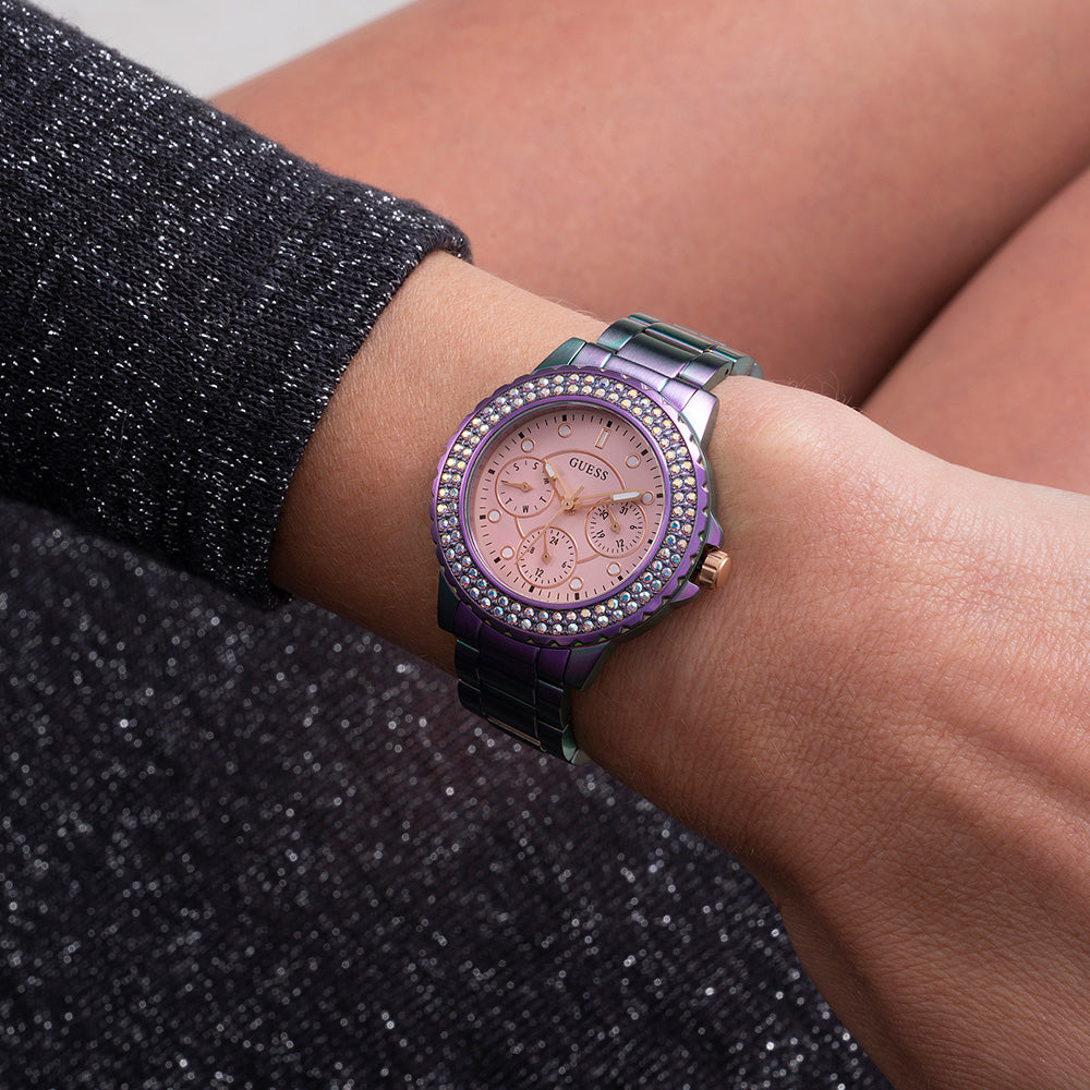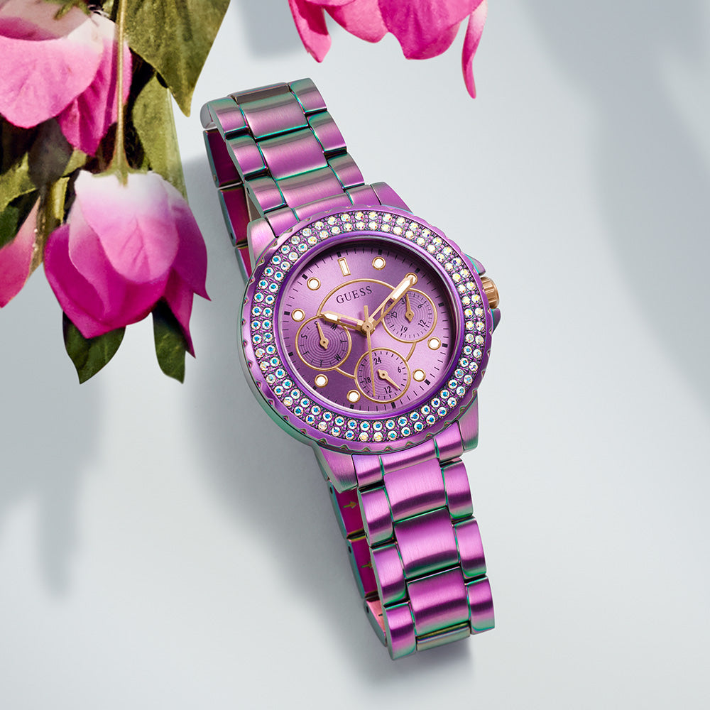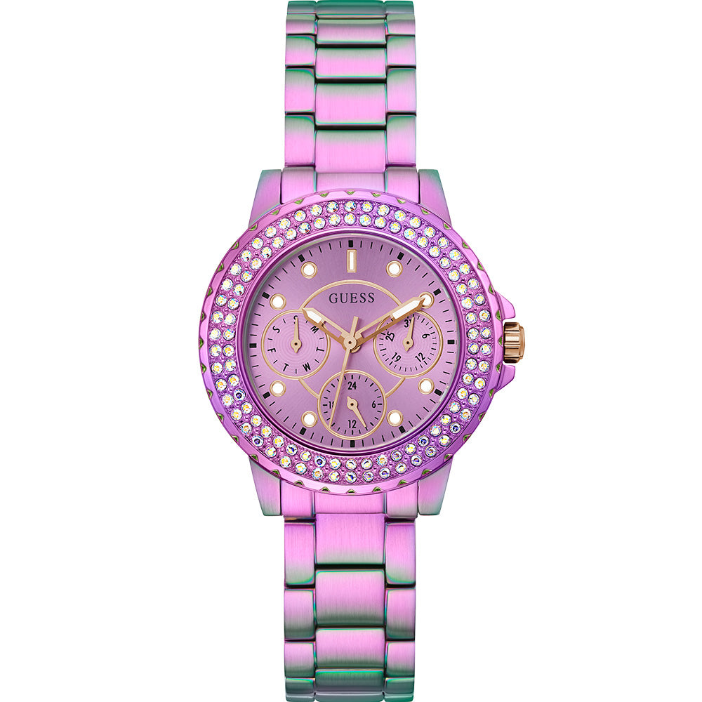 Make a statement with this stunning Guess GW0410L4 Crown Jewel Violet Womens Watch. This piece is unlike any other with a lovely purple stainless steel finish and green hues that reflect in the light. The bezel is embellished with sparkling stones that dazzle in the light and create a glamorous look. Meanwhile, the watch face features a chronograph and the iconic Guess logo. A watch that is sure to turn heads wherever you go, this statement piece will take your look to the next level.