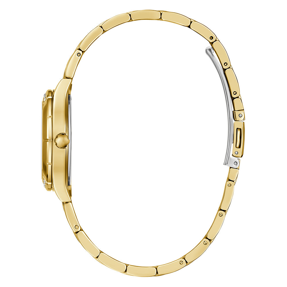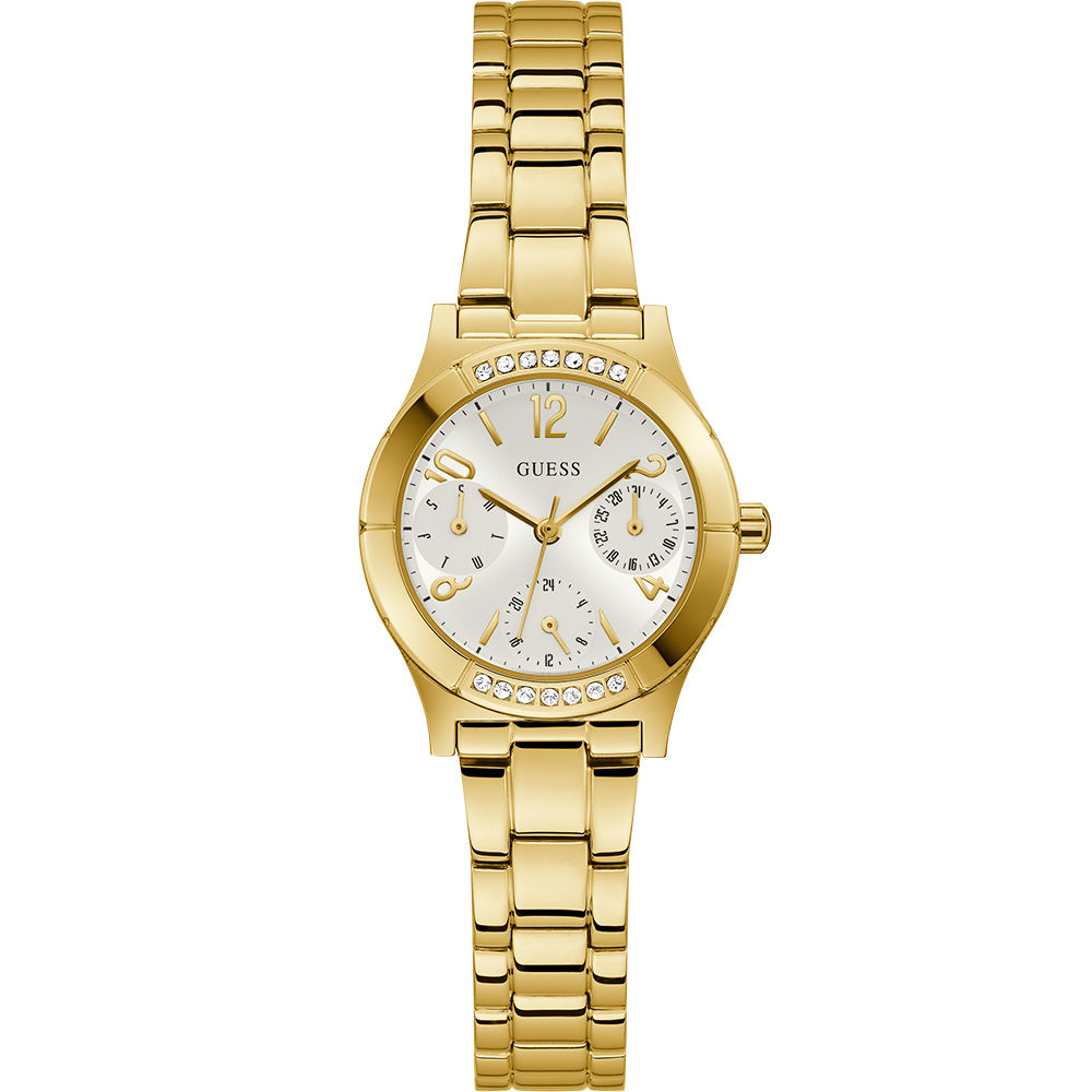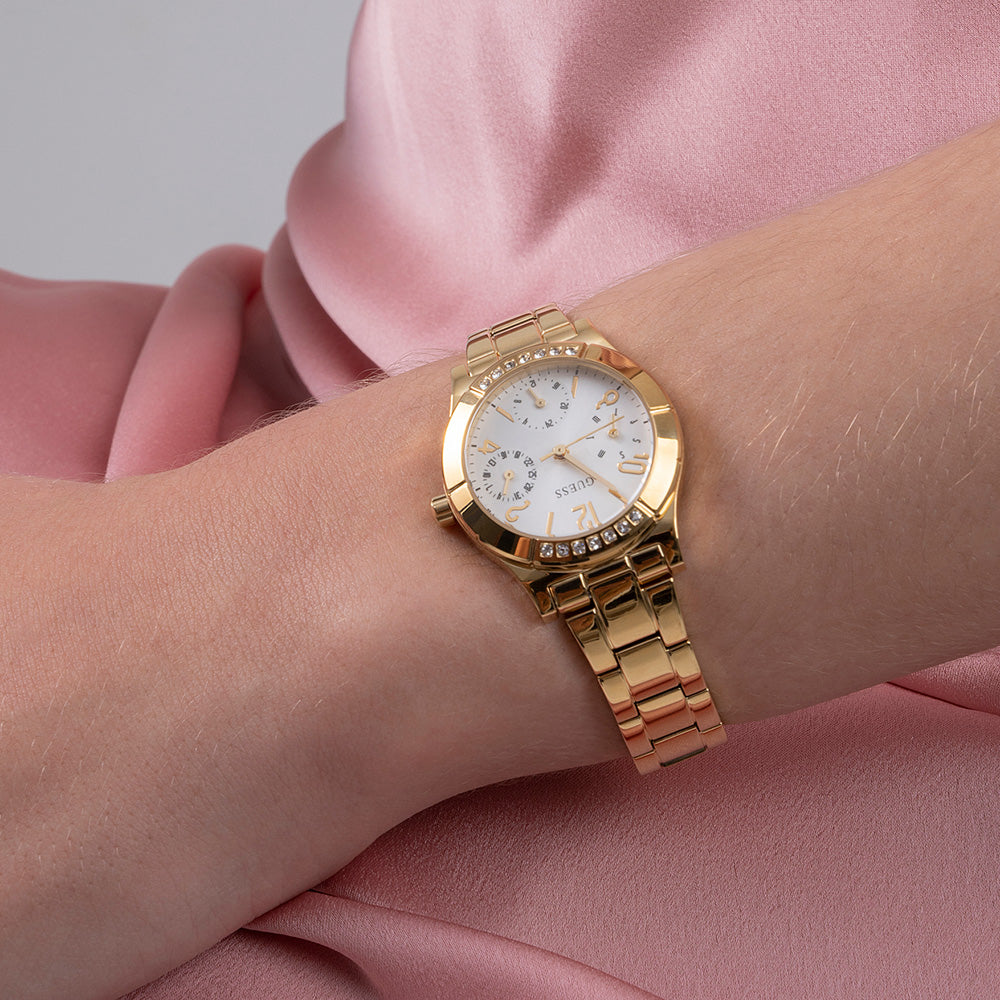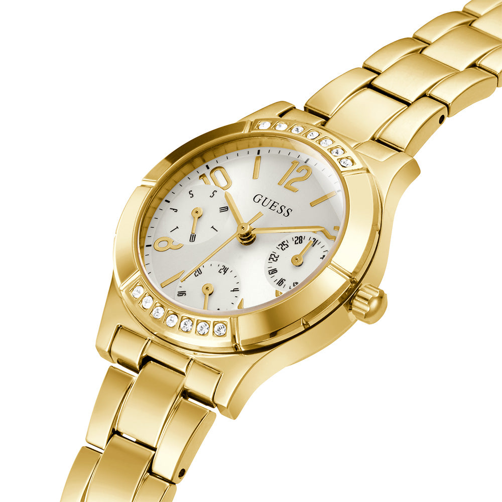 Introducing the Guess GW0413L2 Piper Watch, where timeless elegance meets contemporary sophistication. Featuring a radiant gold-tone PVD stainless steel case and bracelet, this timepiece is adorned with a dazzling crystal-embellished bezel that catches the light beautifully. The silver sunray dial complements the luxurious aesthetic, creating a striking contrast against the gold tones. With a delicate 29mm case size and slim 9mm case thickness, it exudes refinement and femininity. Protected by a mineral crystal and offering water resistance up to 30 meters, the Guess Piper watch combines style with functionality, making it a perfect accessory for any occasion.