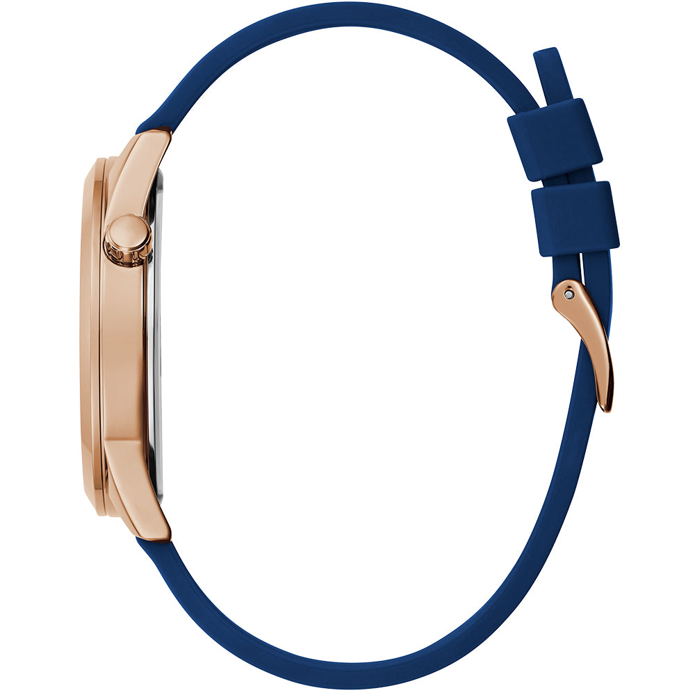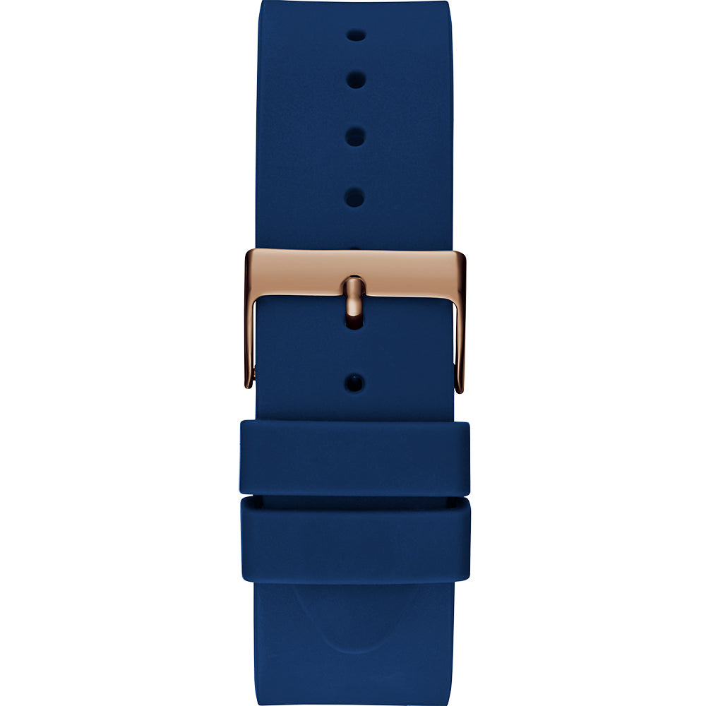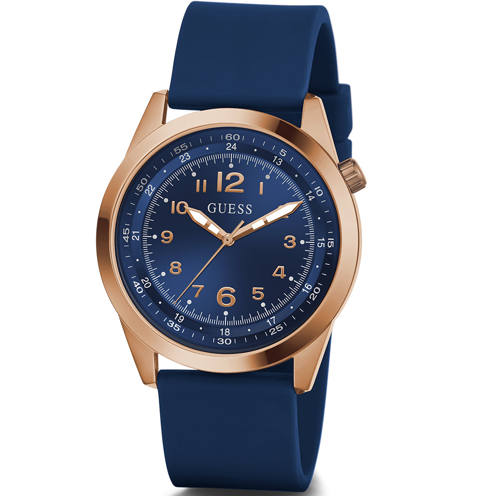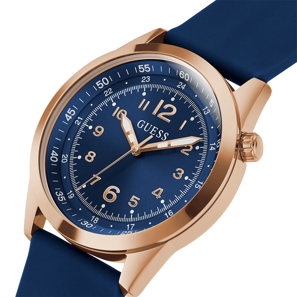 Meet the Guess GW0494G5 Max, a watch that seamlessly blends classic elegance with sporty appeal. Featuring a luxurious rose gold tone stainless steel case and a striking navy-blue dial, this timepiece is designed to make a statement. The unique dial showcases an outer ring tachymeter design and bold Arabic numerals for clear, effortless time reading. Complemented by a blue silicone strap, the Max watch offers both style and comfort. With a 42mm case size, durable mineral crystal, and 50 meters of water resistance, it combines refined aesthetics with practical functionality, perfect for any occasion.