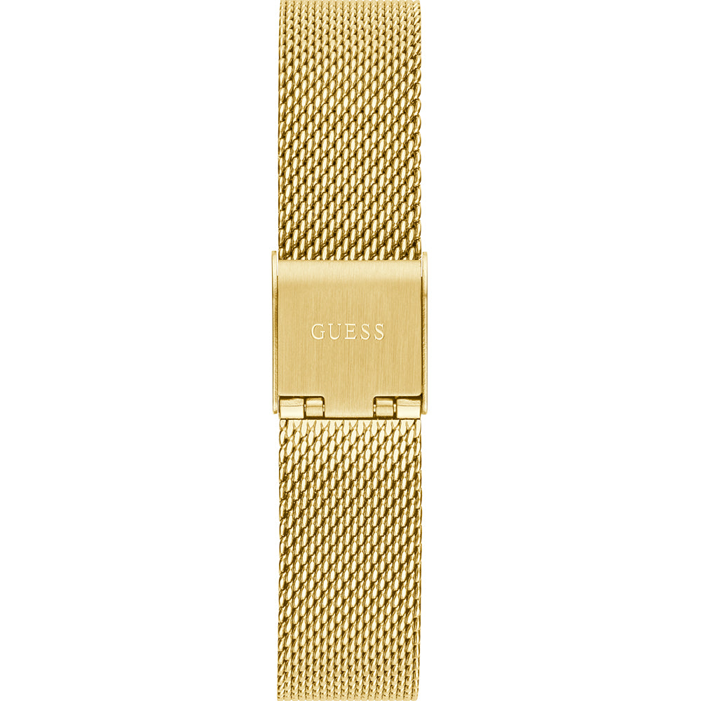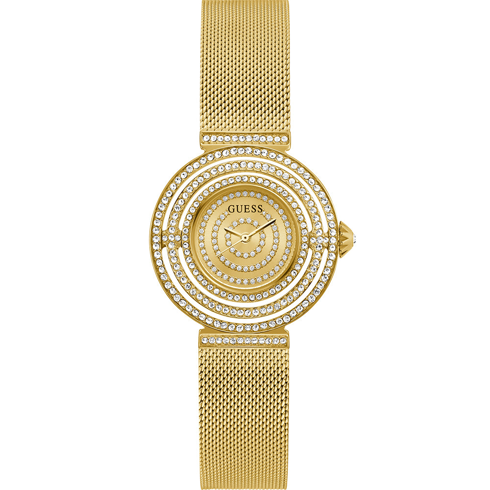 Introducing the Guess GW0550L2 Dream watch, a captivating embodiment of opulence and sophistication. This exquisite timepiece features a lustrous gold tone stainless steel case complemented by a dazzling crystal embellished bezel, adding a luxurious sparkle to every glance. The gold dial enhances its regal charm, while the self-adjustable mesh band ensures a comfortable and personalized fit. Highlighted by a unique crown design and an over-the-top crystal cut-through dress look, the Dream watch exudes elegance and refinement. With a delicate 32mm case size, durable mineral crystal, and water resistance up to 30 meters, it blends exquisite craftsmanship with practical functionality, making it an ideal choice for elevating any ensemble with timeless allure.