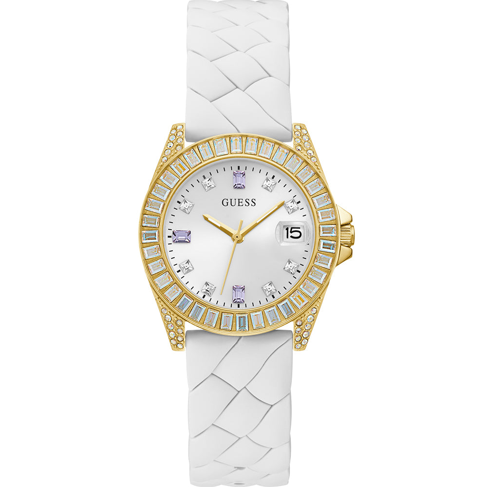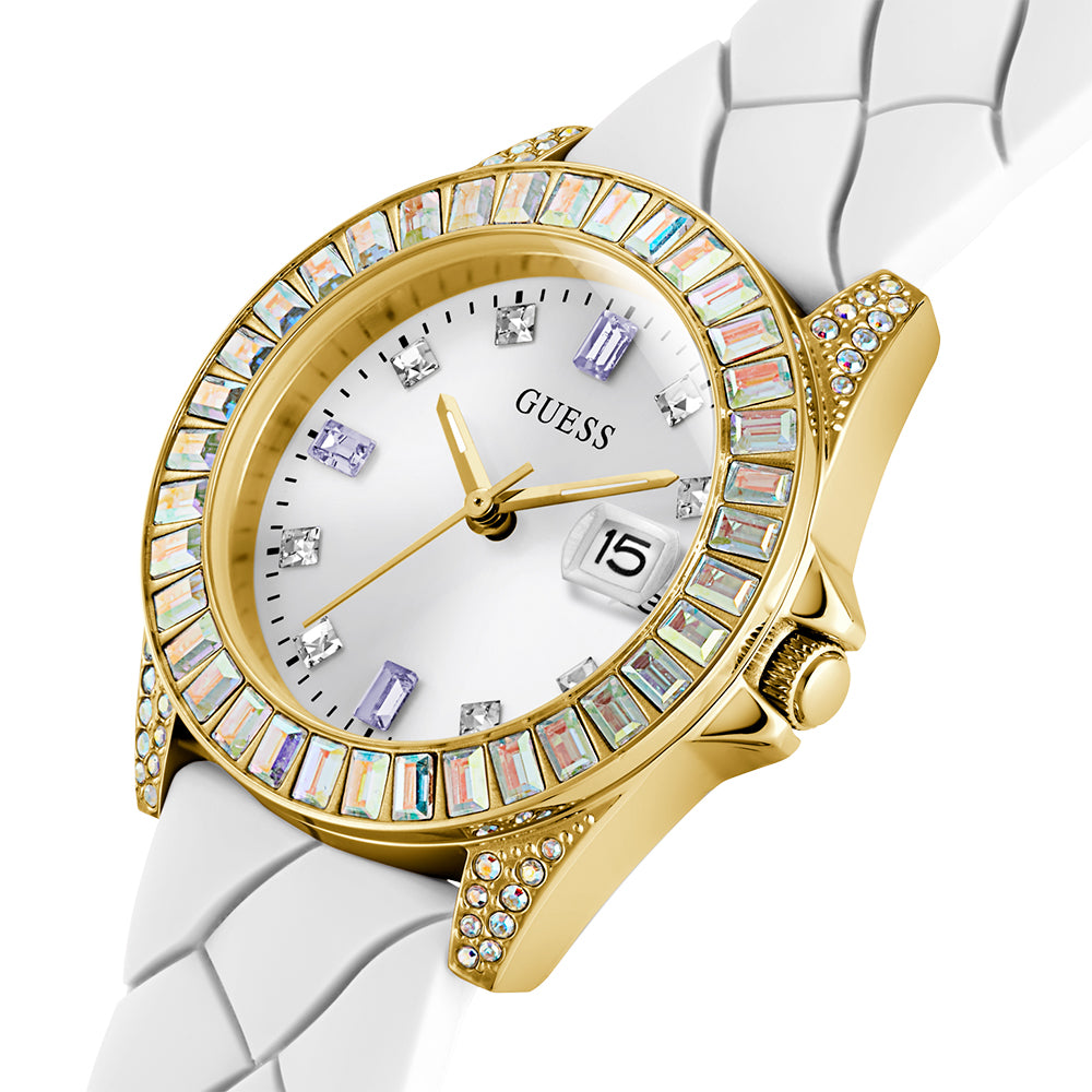 Introducing the Guess GW0585L2 Opaline, a captivating timepiece that combines elegance with a touch of sporty sophistication. Featuring a gold-tone stainless steel case adorned with baguette crystals on the bezel, this watch exudes luxury and glamour. The white braided silicone strap not only adds a contemporary twist but also ensures comfort and durability.