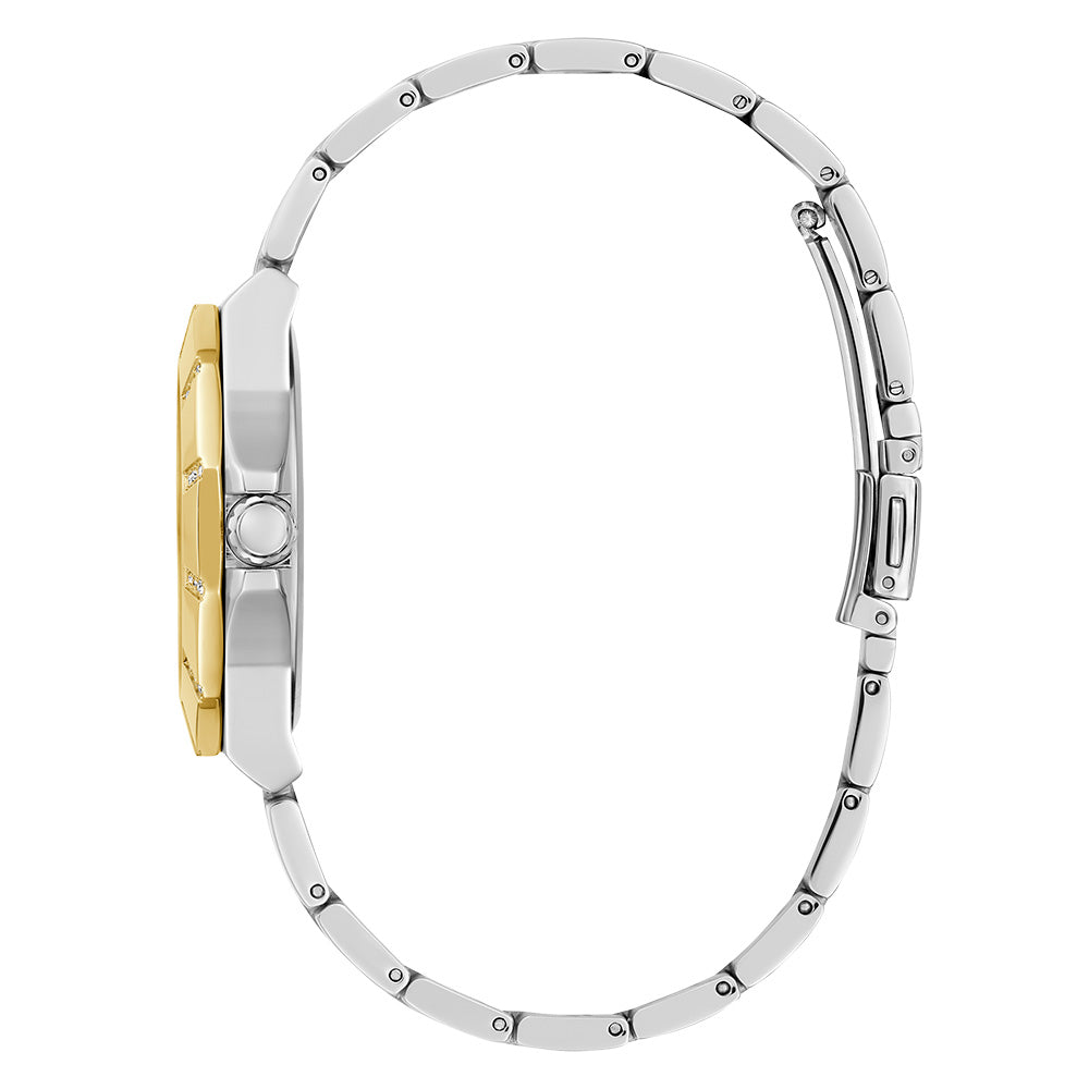 This timepiece is designed with a beautiful sunray of crystals which accentuates this two-tone watch. Brighten up your style with an accessory that enhances your look.