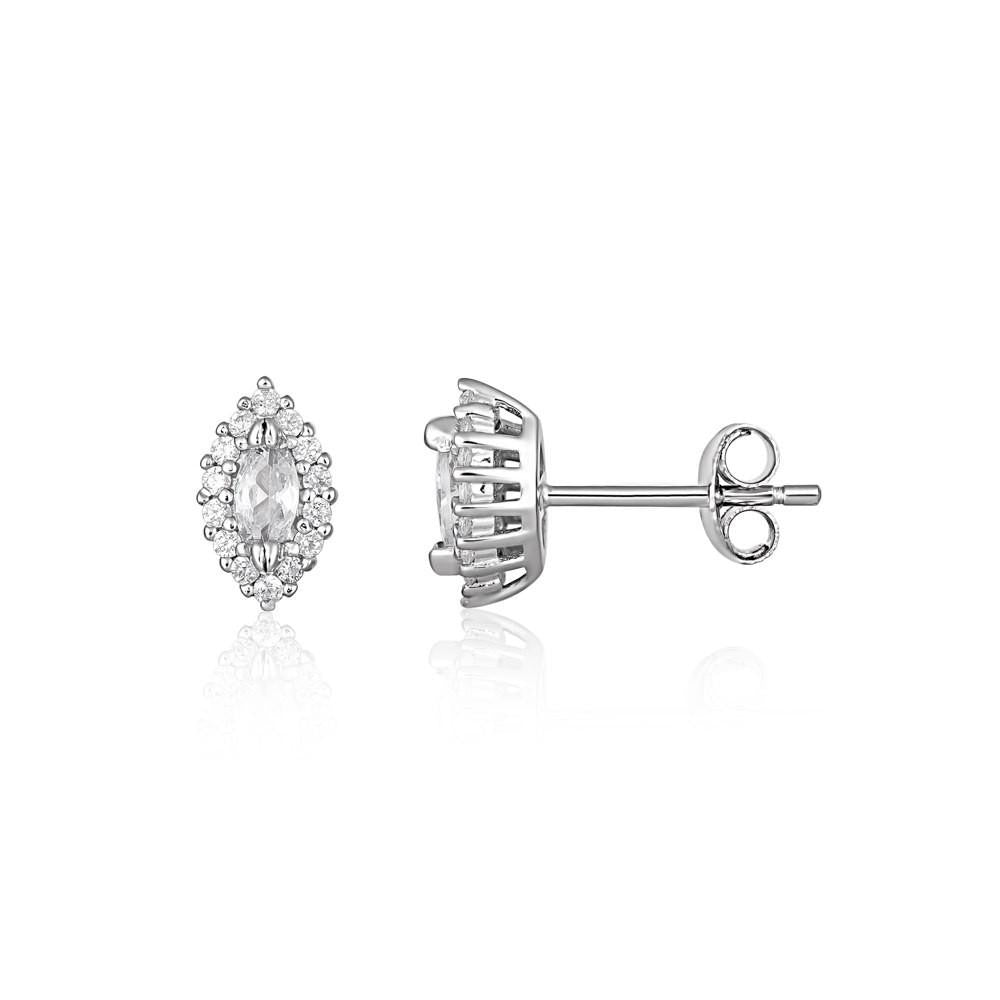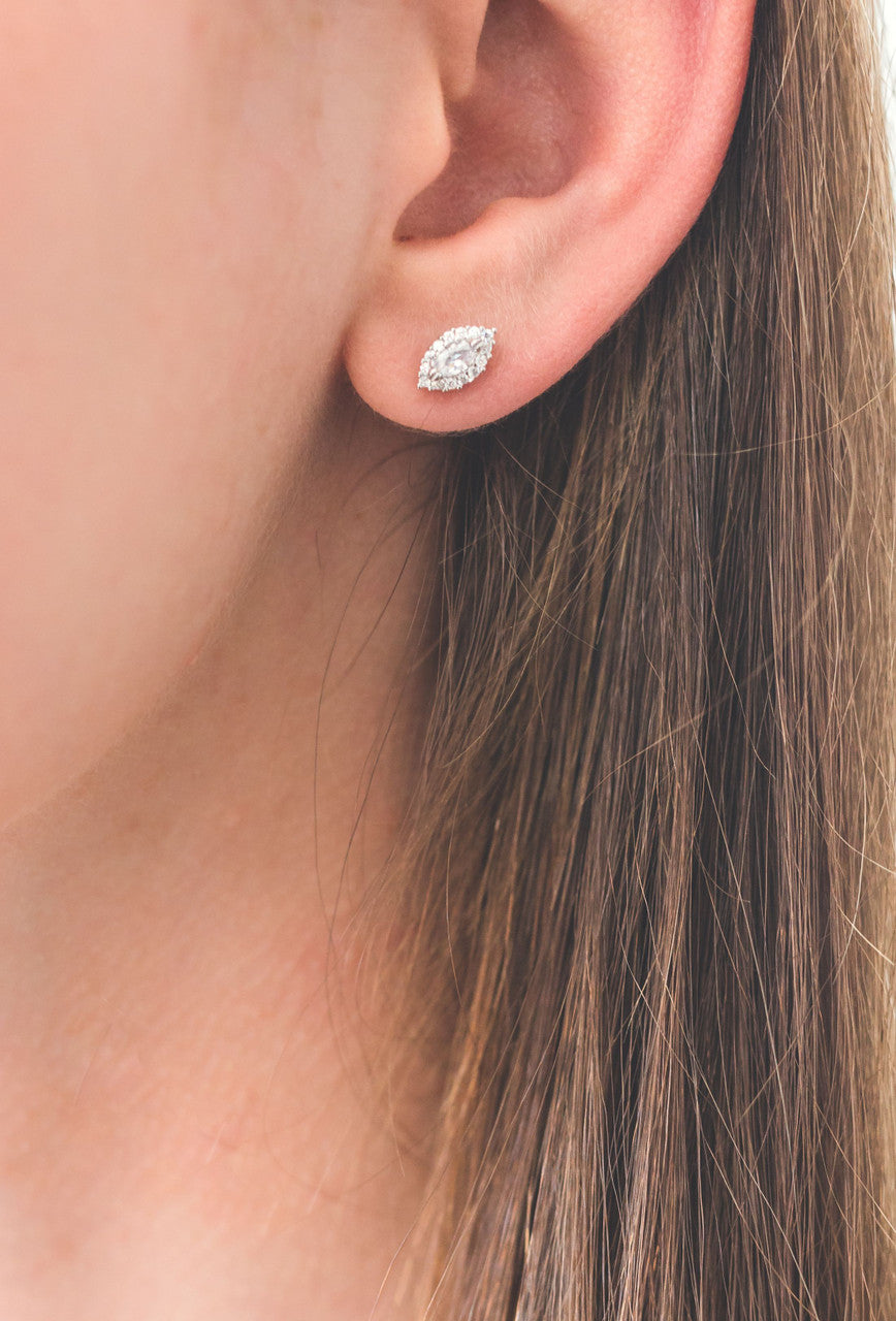 The Evermore earrings are a great addition to any collection or a lovely gift. Featuring the Heirloom statement cut stone the Marquise, they combine an approximately 5mm V prong set Marquise with a halo of 14 sparkling stones. Wear north-south or combine with the evermore pendant to change it up to east-west for a more daring take on the marquise style. Crafted in 925 Sterling Silver and Rhodium plated they measure approximately 9mm.
