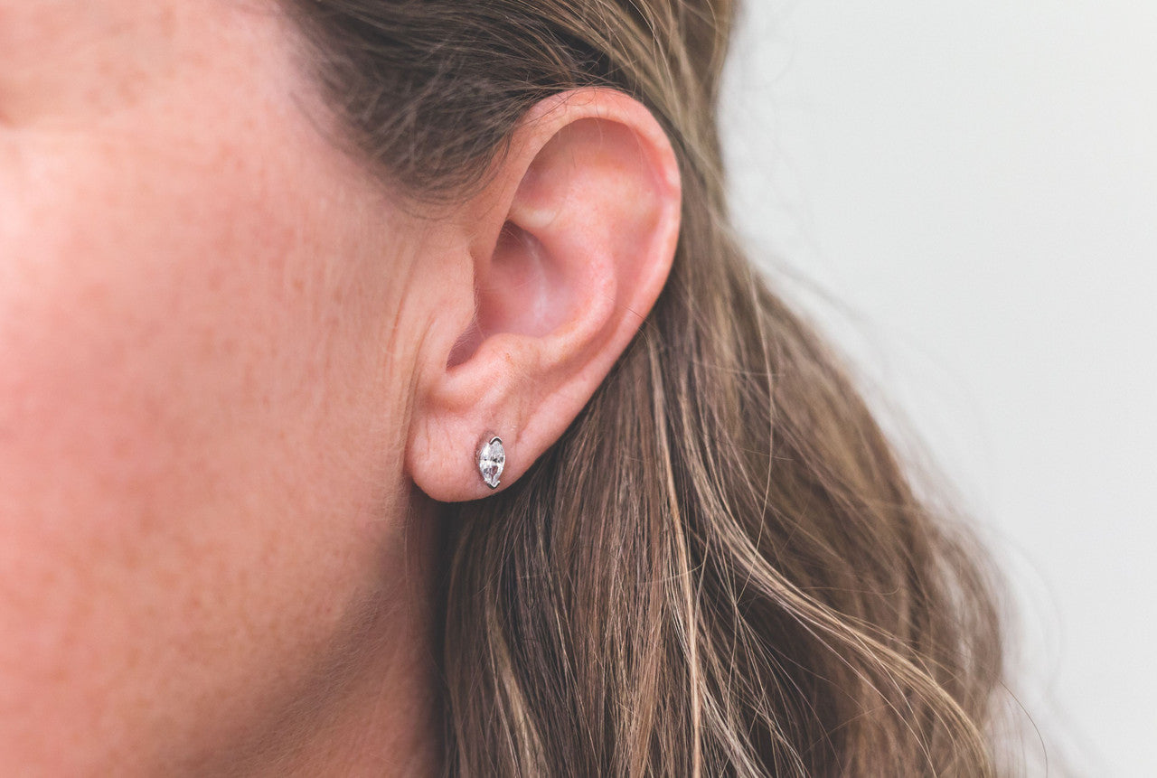 The Forever earrings feature a beautifully cut marquise stone in a simple V prong setting. Combine them with the Forever pendant and ring for a classic and seamless look. These earrings are also designed to work with any of the Marquise cut earrings in the Heirloom collection as a feature for your additional piercings. Crafted in 925 Sterling silver and Rhodium plated. Measures approximately 8.85mm