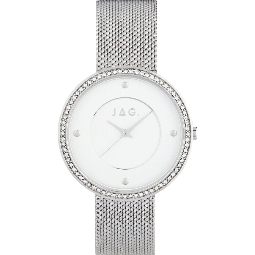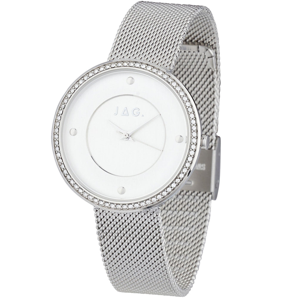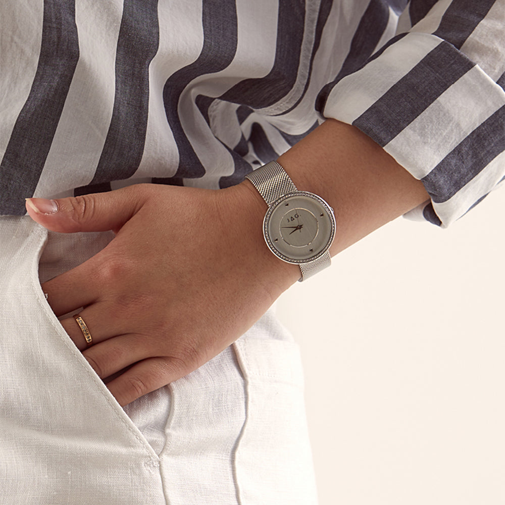 • • Case Material: Stainless Steel • Case Colour: Silver • Stone Set Bezel • Strap: Bracelet, Mesh Colour: Silver • Dial Colour: White Brushed