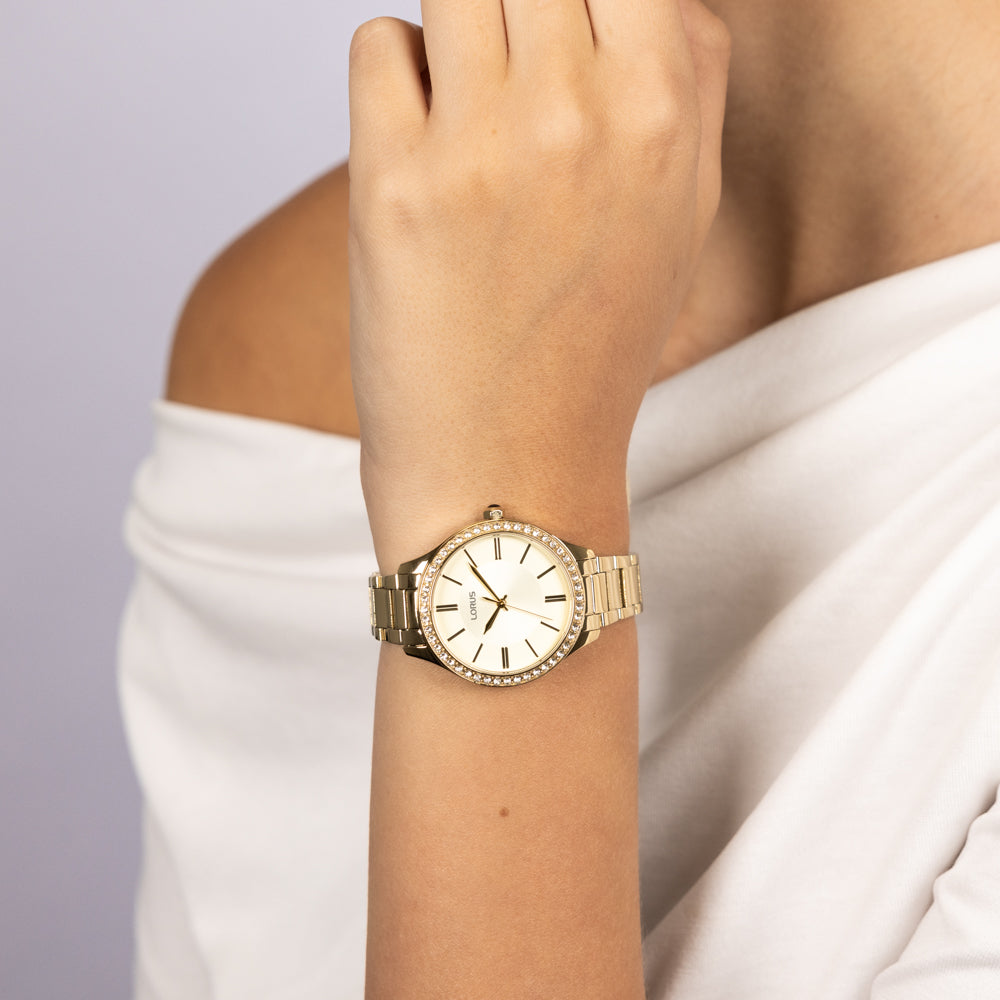 - Quartz - Powered by A Battery - 33mm Case Size - Stainless Steel Case and Bracelet - 50 Meters Water Resistant - Mineral Crystal - Hand Indicators: Hour, Minute, Second