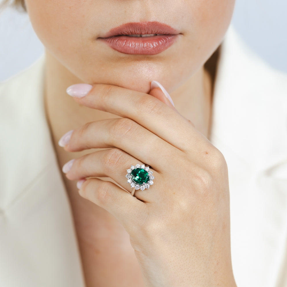 Luminesce Lab Grown 3 Carats Created Emerald with 0.70 Carat Diamond Ring in Sterling Silver