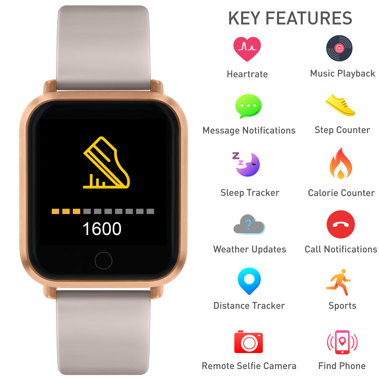 Our sleek Series 06 smart watches include premium features to track your fitness with our easy to use app. Key features include colour touch screen, activity goals, step counter, remote camera, sleep tracking, calories, weather, find my phone, alarm, call alert, message alert and display. There are additional features including heart rate monitor and music control. Soft silicone band.
