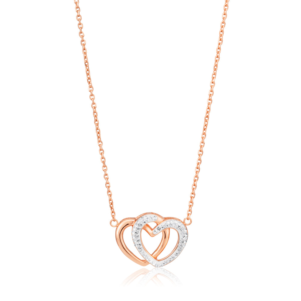 Rose Gold Plated Stainless Steel Crystal Double Heart Pendant with 43cm + 6.5cm Chain