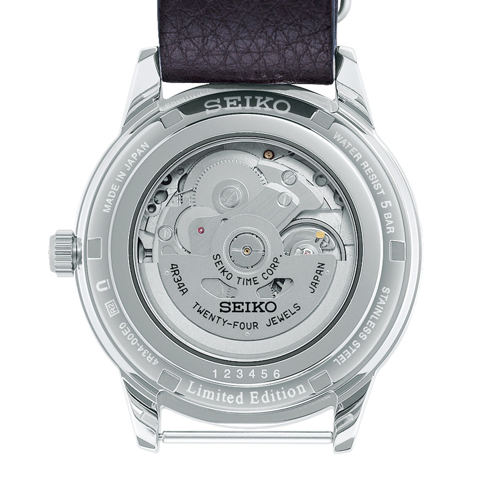 • Calibre 4R34 • Screw See-Thru Case Back • Stainless Steel Case • Brown Leather Band • Case Size 40.8mm • 50 Metres Water Resistant