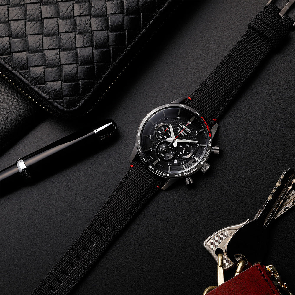 • • Stainless Steel Case • Leather Strap • Quartz Movement • Caliber: 8T63 • Black Dial • Hardlex Crystal • Analog Display • Chronograph Function • Tachymeter Scale • 12/24 Hours Display • Accuracy: ±15 Seconds Per Month • Luminous Hands And Indexes • Date Display • Screwed Case Back • 3 Fold Clasp With Push Button Release • 100M Water Resistance • Approximate Case Diameter: 44mm • Approximate Case Thickness: 13mm