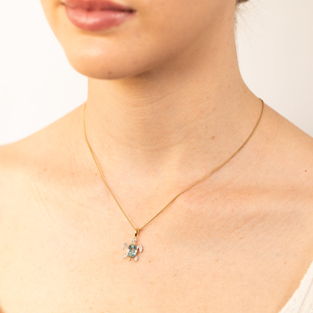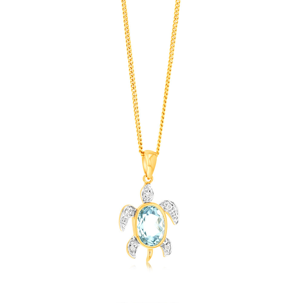 Sky Blue Topaz Tortoise Pendant with 5 Diamonds in 9ct Yellow Gold