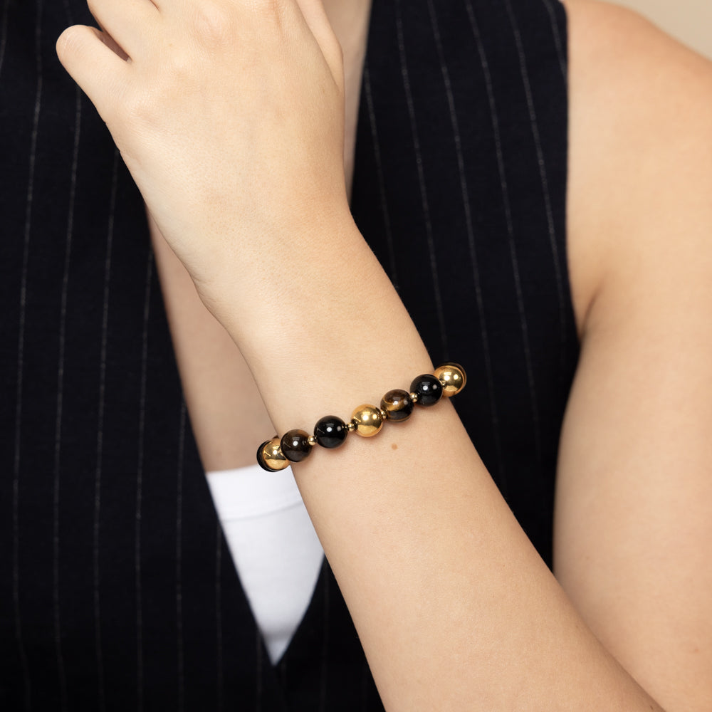 Stainless Steel Gold Plated Black Agate Tiger Eye 17.5cm Stretchable Bracelet
