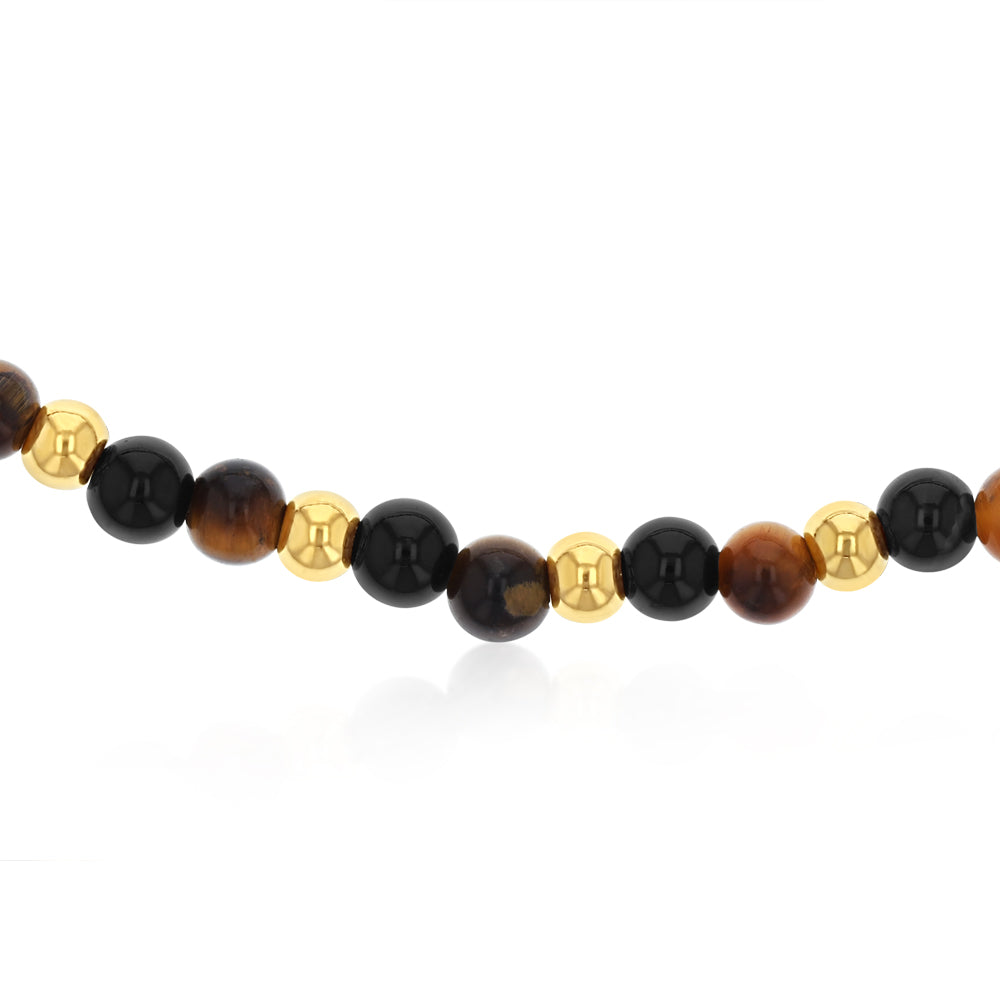 Stainless Steel Gold Plated Black Agate Tiger Eye 17.5cm Stretchable Bracelet