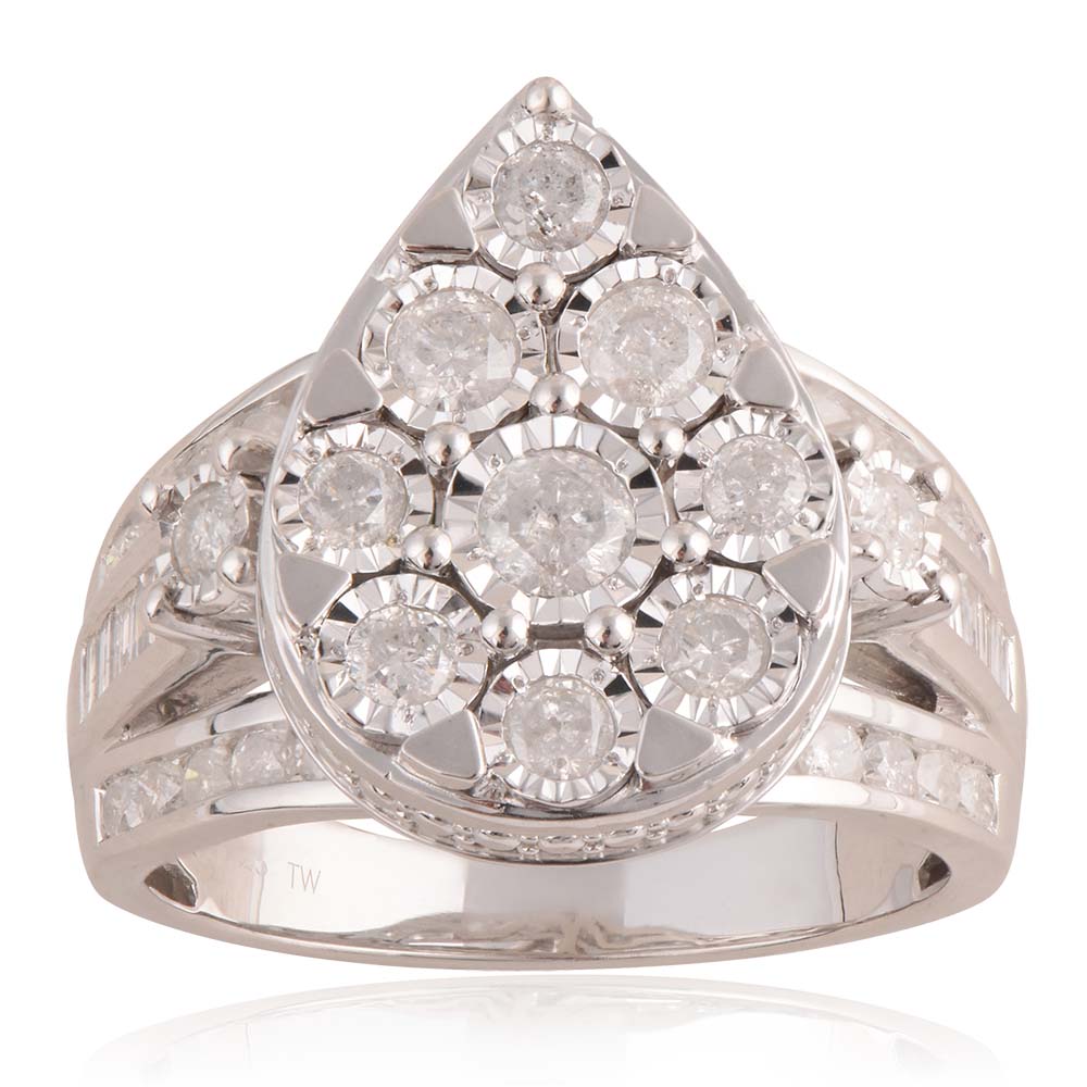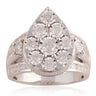 Sterling silver 2 carat diamond pear shaped cluster dress ring.
