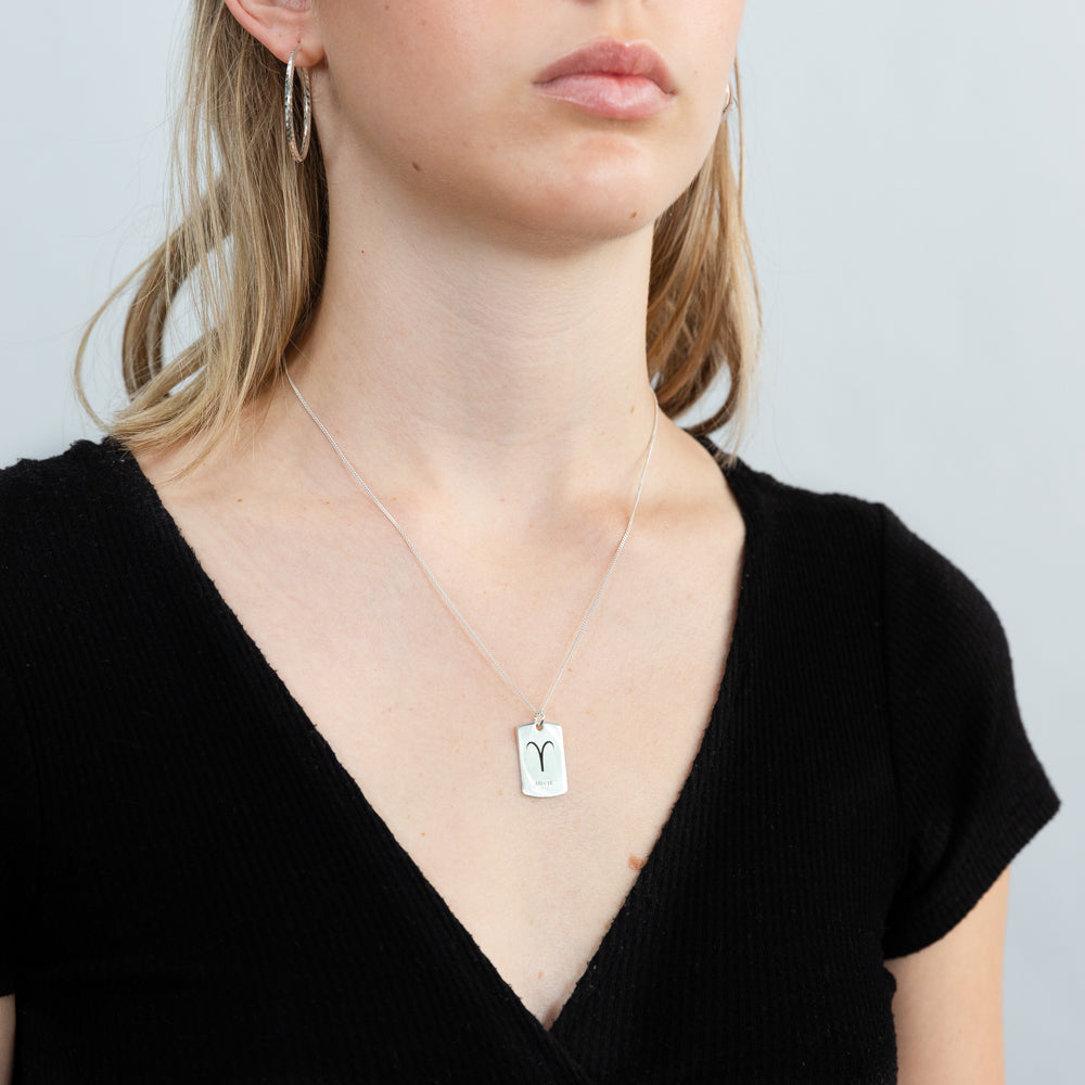 Sterling Silver Dog Tag With Aries Zodiac/Star Sign Pendant