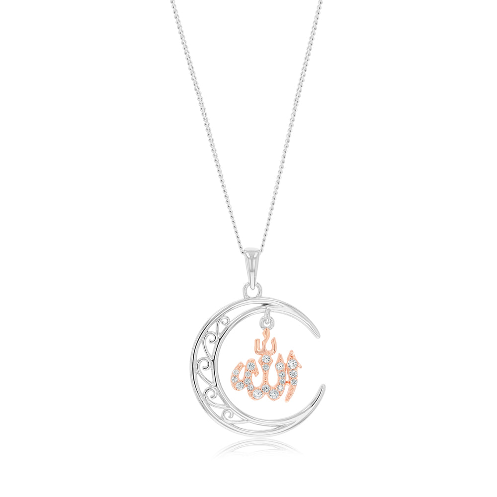 Sterling Silver Filigree Crescent Moon with Rose Gold Plated CZ Allah Pendant