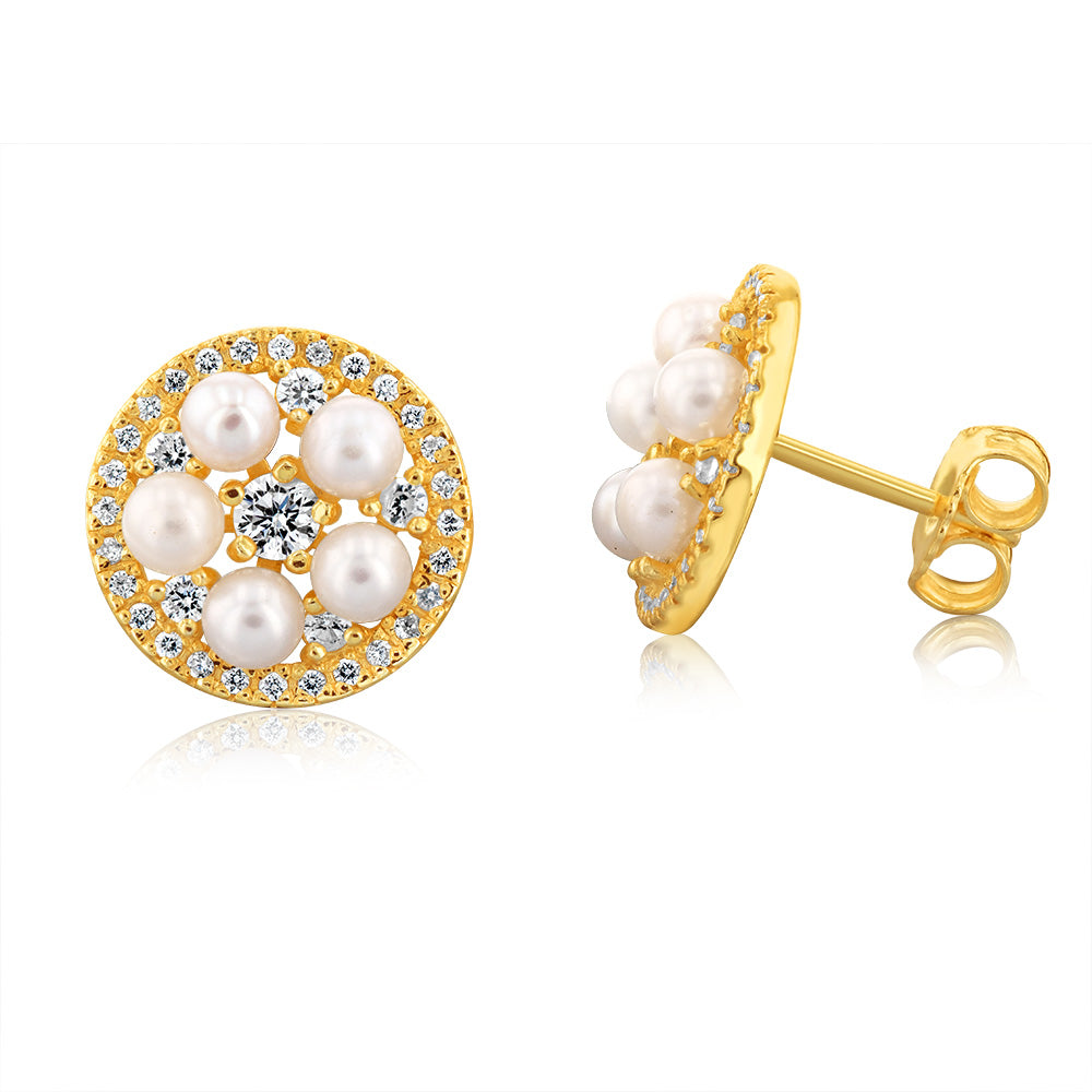 Sterling Silver Gold Plated Fresh Water Pearls And Cubic Zirconia Round Stud Earrings
