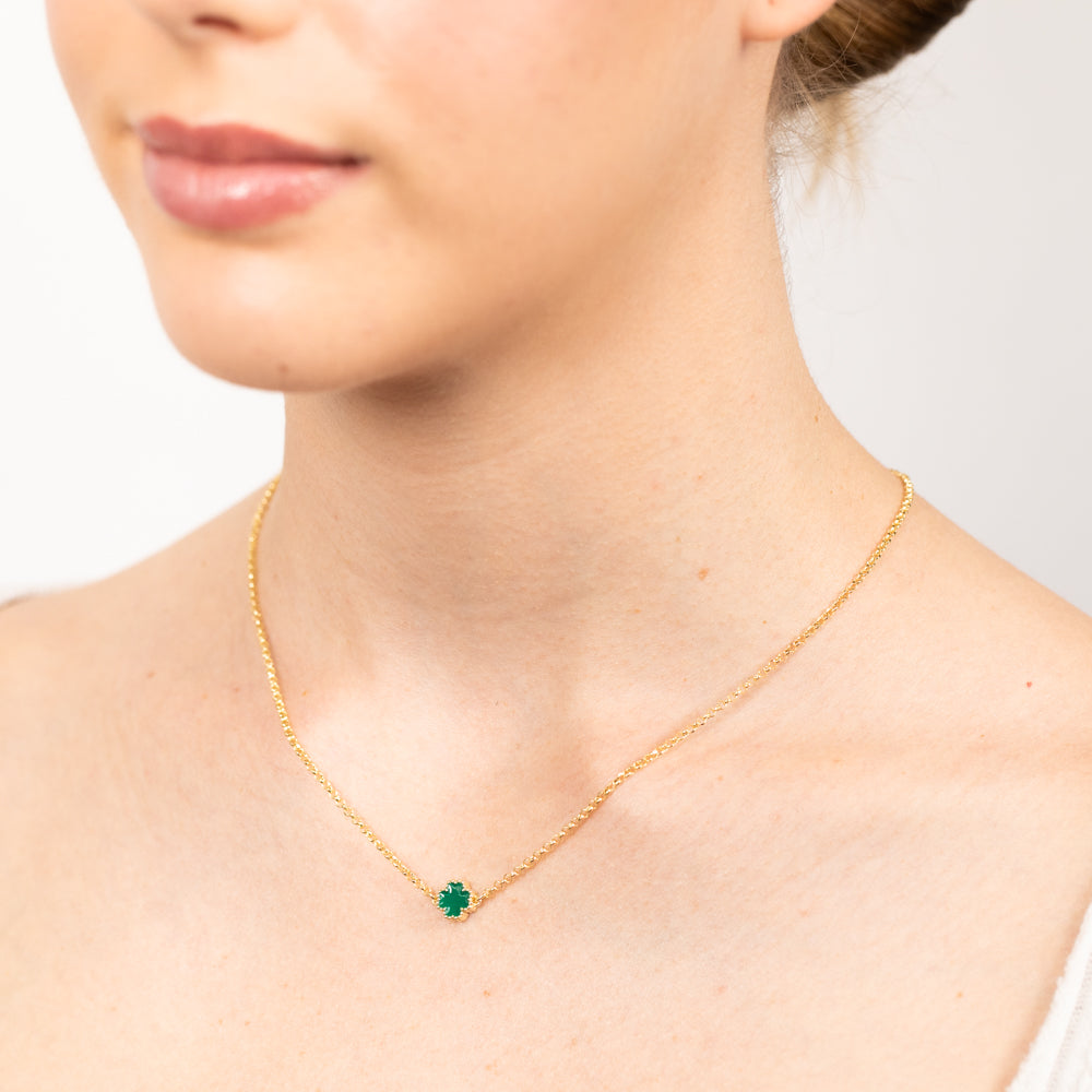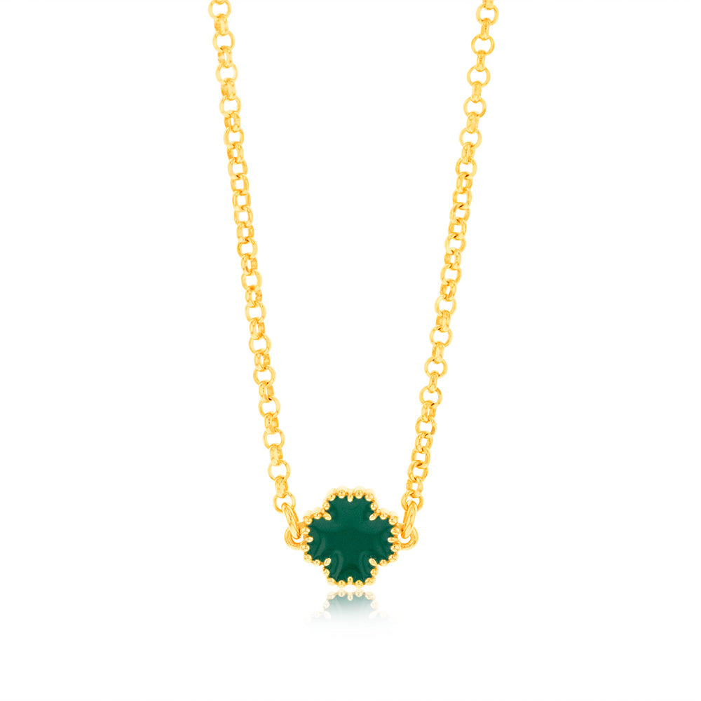 Sterling Silver Gold Plated Green Four Leaf Enamel Flower Pendant On chain