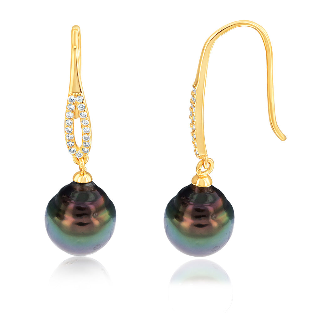 Sterling Silver Gold Plated Tahitian Pearl & Zirconia Drop Earrings
