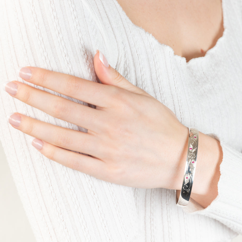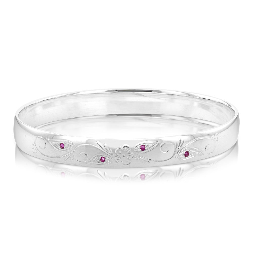 Sterling Silver Hand Engraved Ruby 65mm Bangle