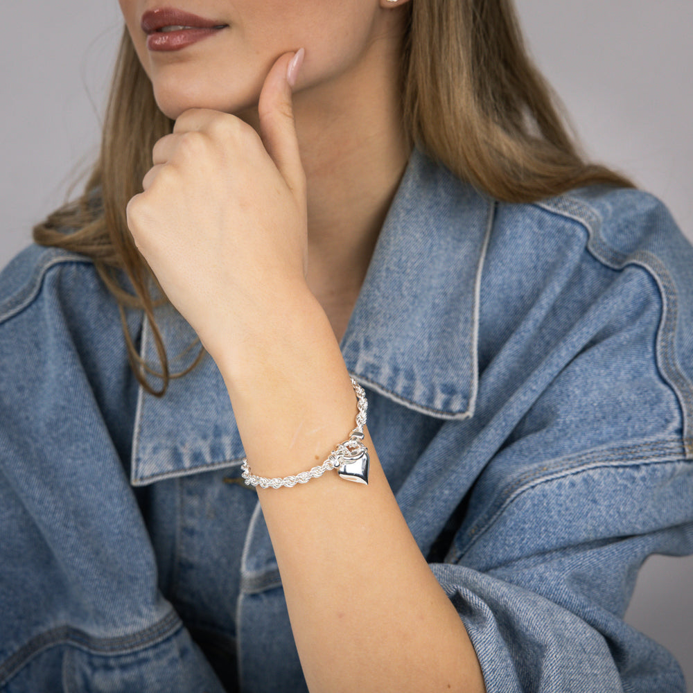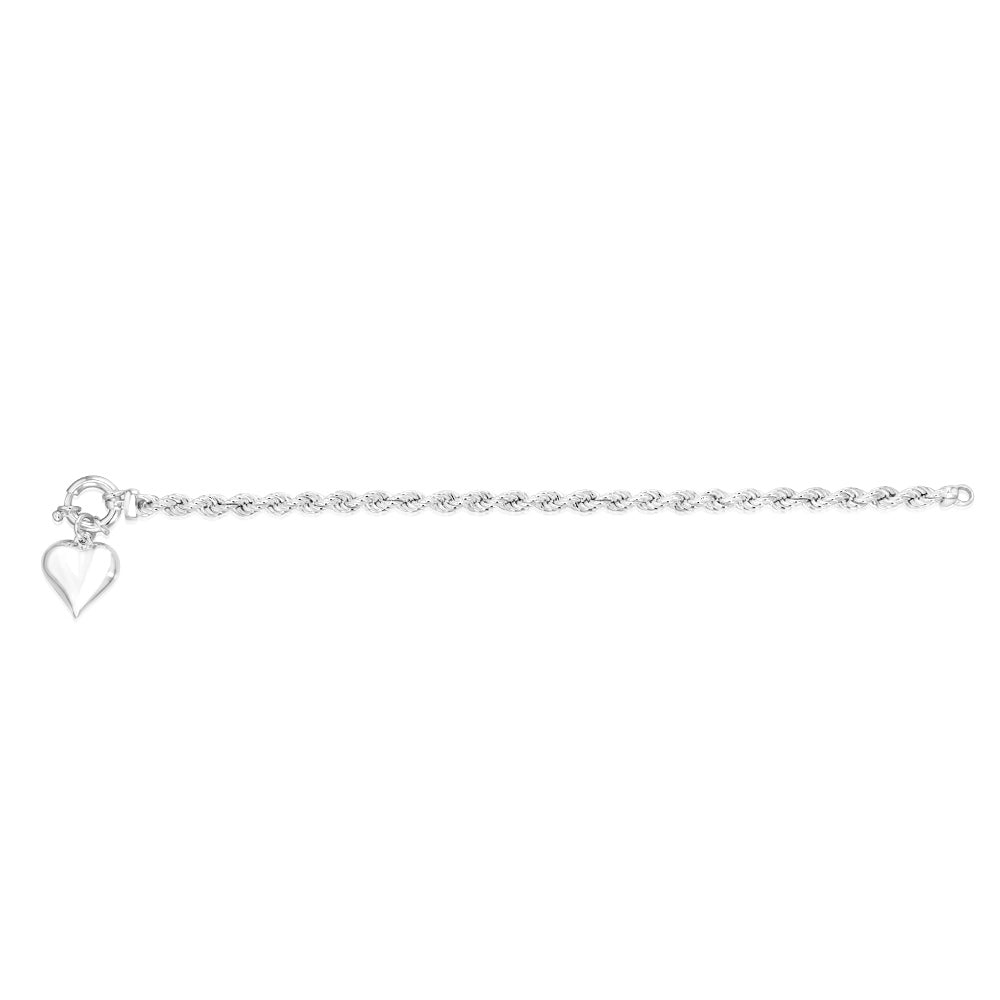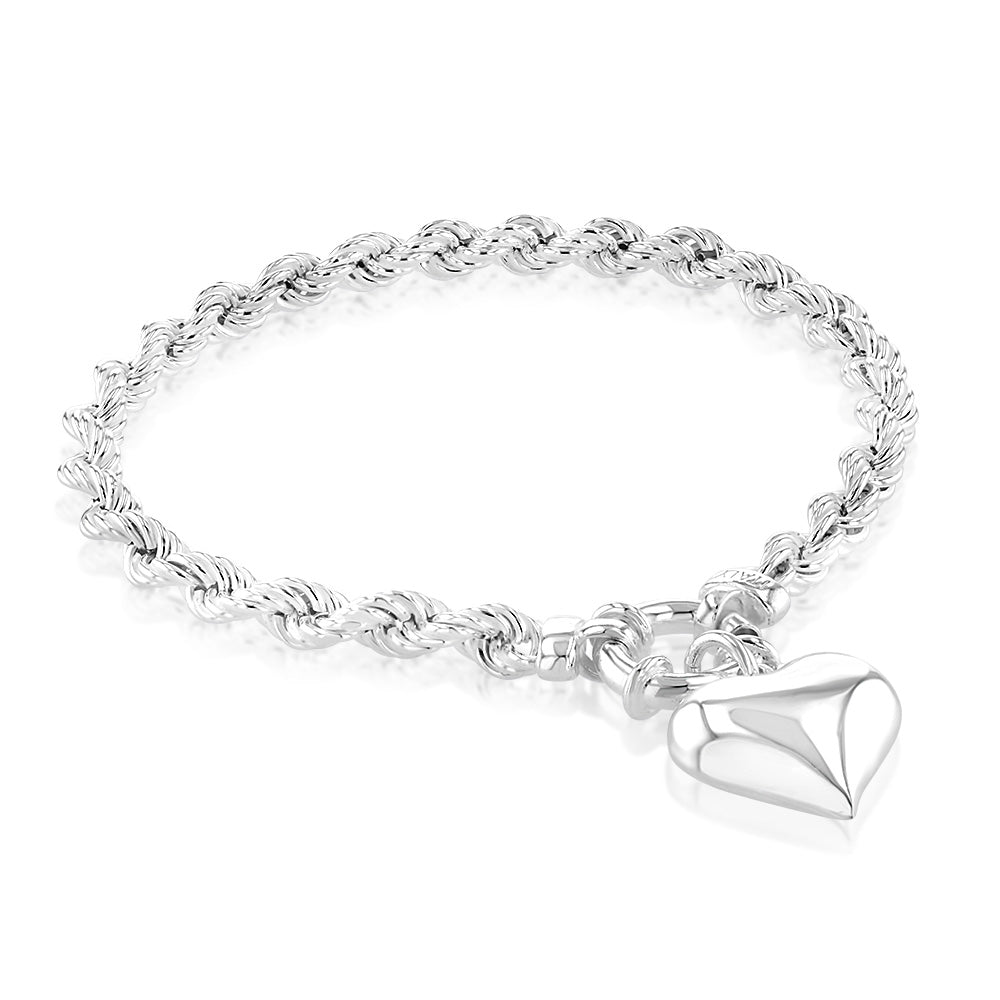 Sterling Silver Heart Charm Bolt Ring Clasp 90 Gauge Rope 19cm Bracelet