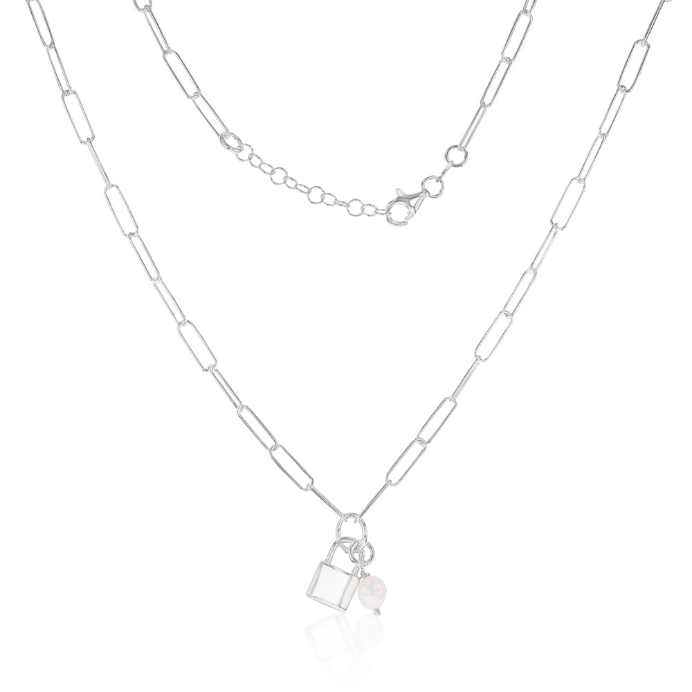 Sterling Silver Lock & Pearl Pendant On 45cm Paperclip Chain