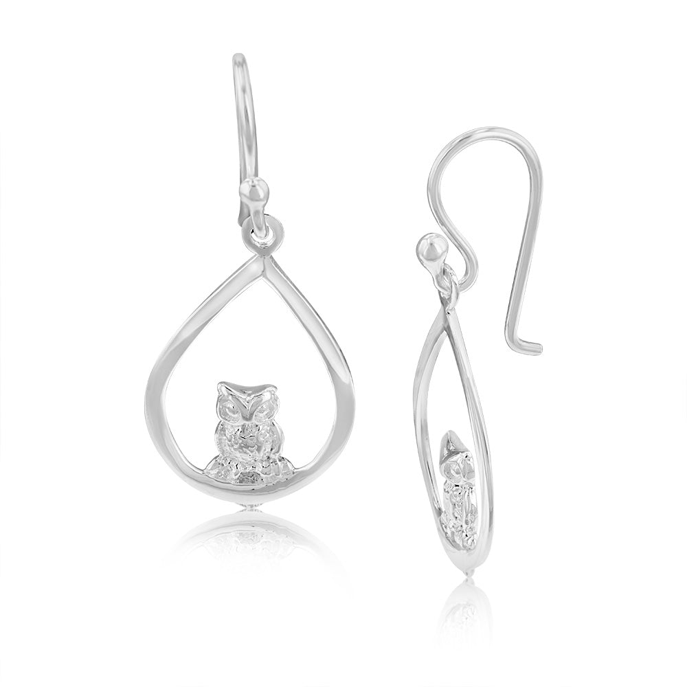 Sterling Silver Owl In Pear Drop Earrings