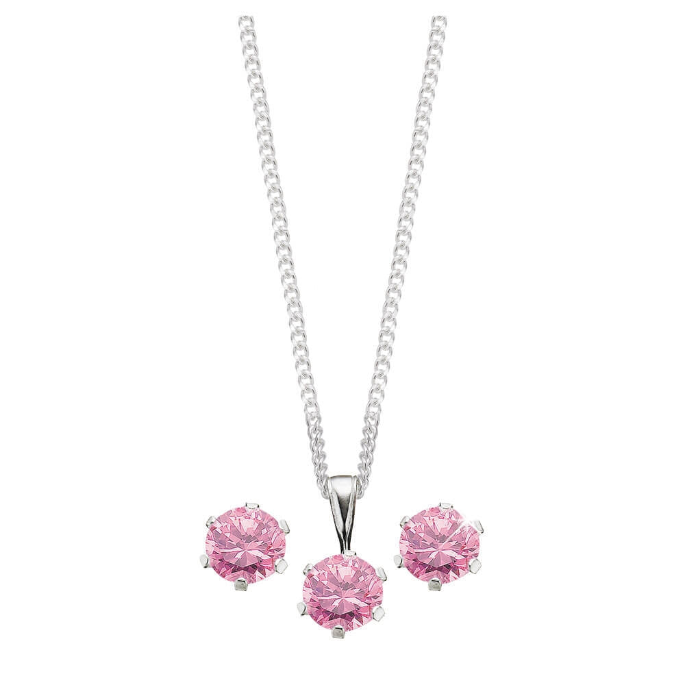 Sterling Silver Pink Cubic Zirconia Stud Earrings and Pendant on Chain Set