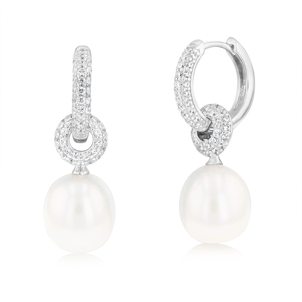Sterling Silver Rhodium Plated 10.5-11mm Drop Fresh Water Pearl And Zirconia Earrings