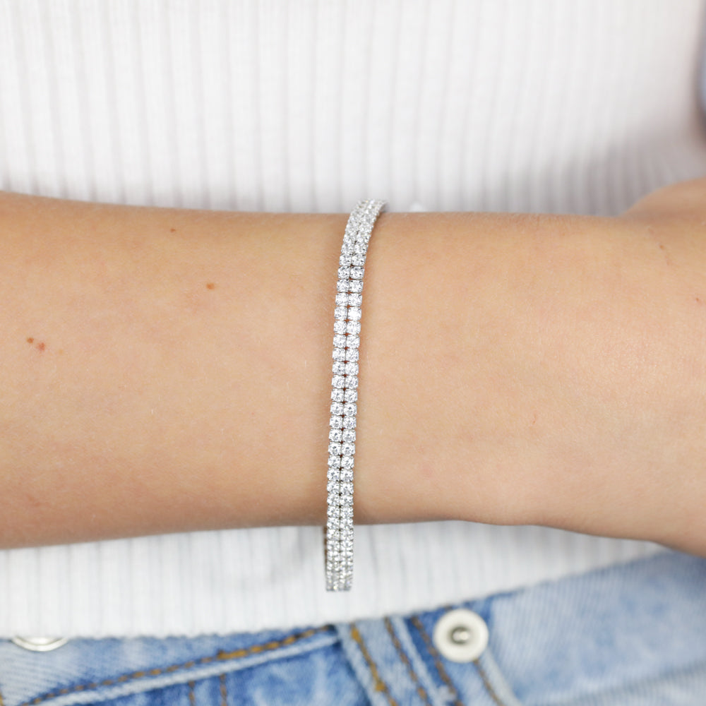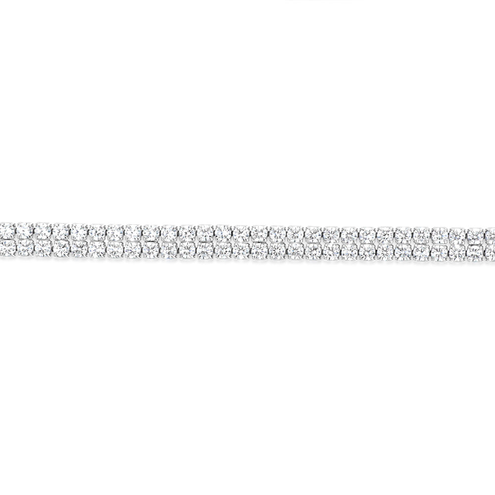 Sterling Silver Rhodium Plated 2mm Cubic Zirconia Two Row 16+3cm Tennis Bracelet