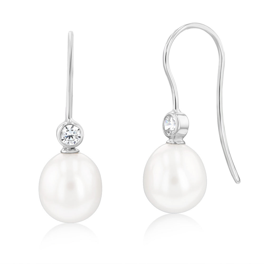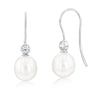 Sterling Silver Rhodium Plated 8.5-9mm Oval Fresh Water Pearl And Zirconia Hook Earrings