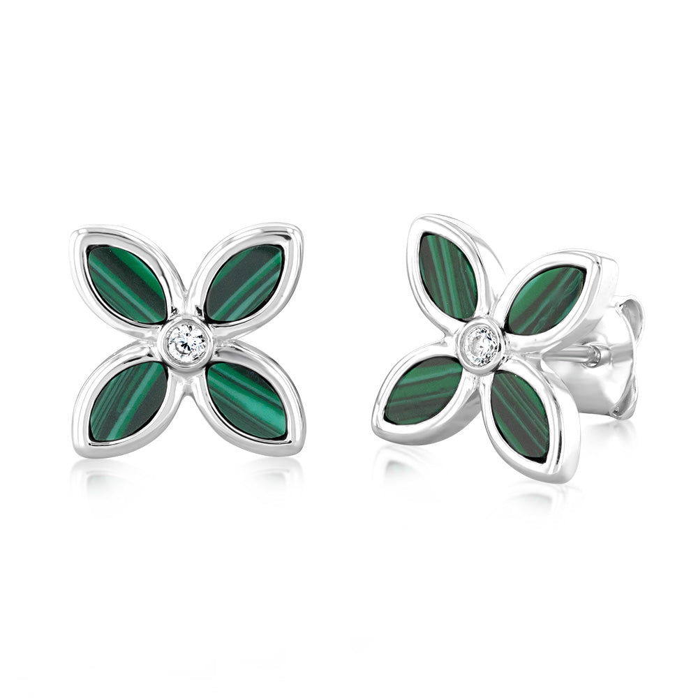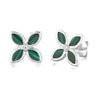 Sterling Silver Rhodium Plated Created Malachite Four Petal Stud Earrings
