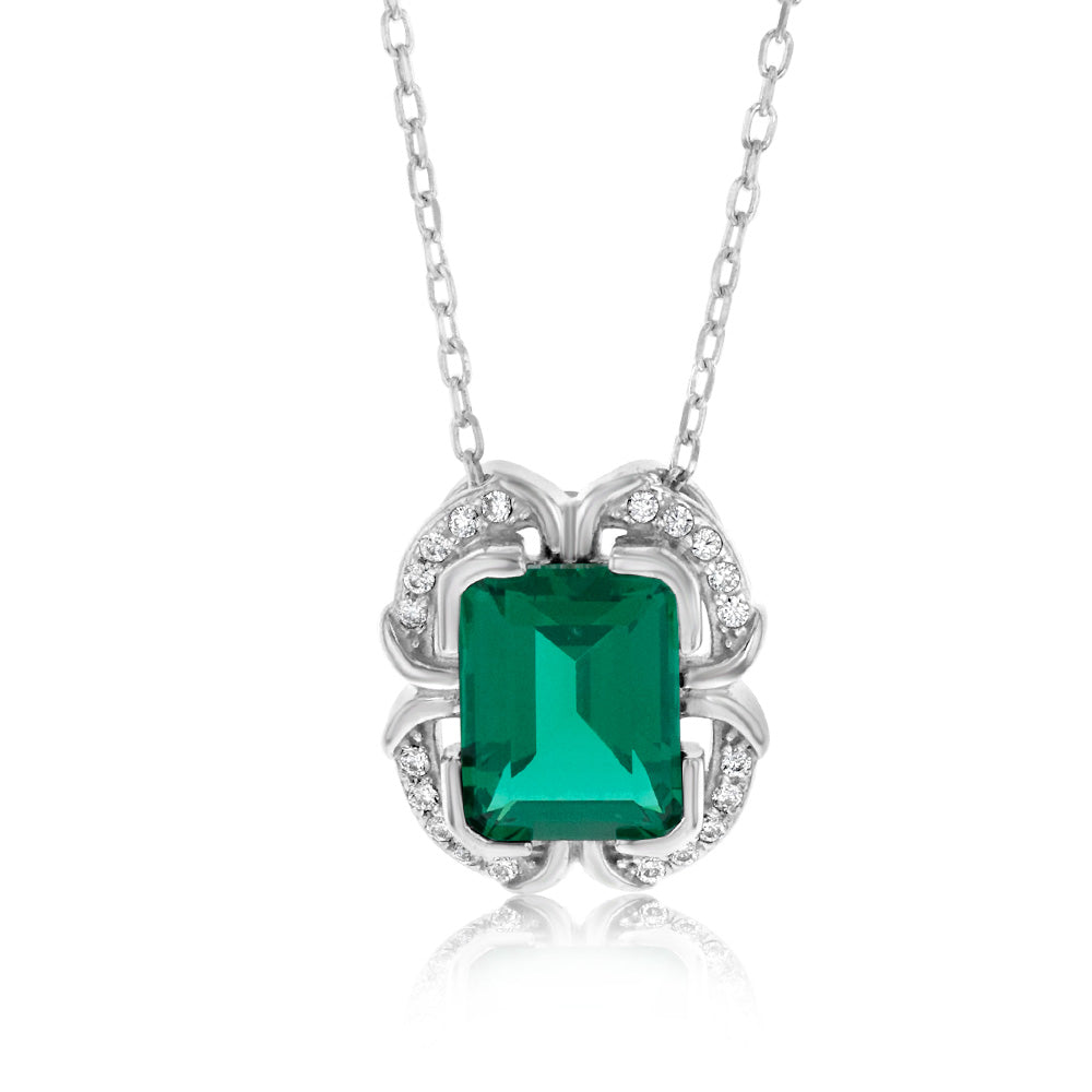 Sterling Silver Rhodium Plated Emerald And White CZ Pendant With 45cm Chain