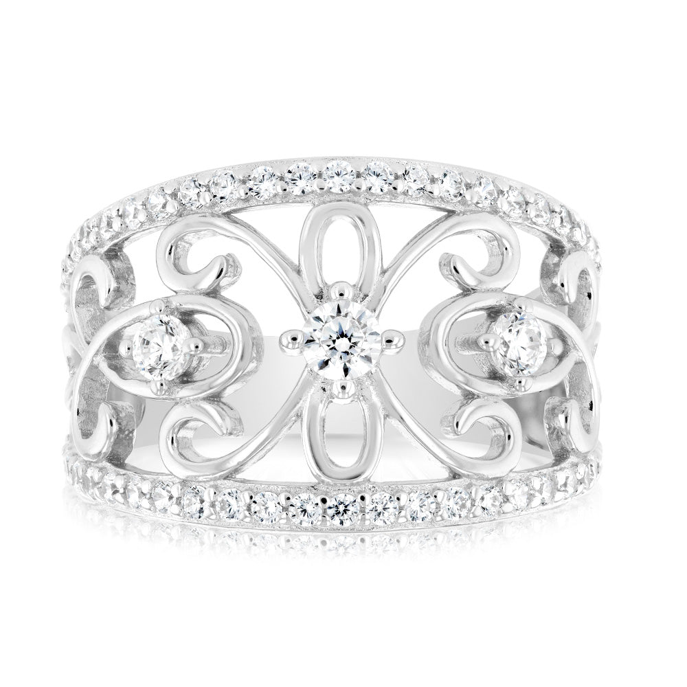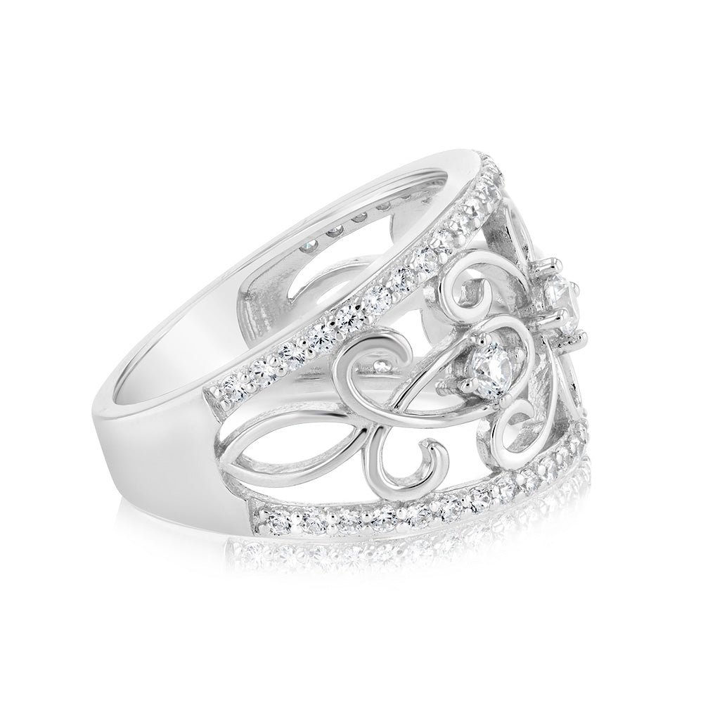 Sterling Silver Rhodium Plated Fancy Cut Out Zirconia Ring