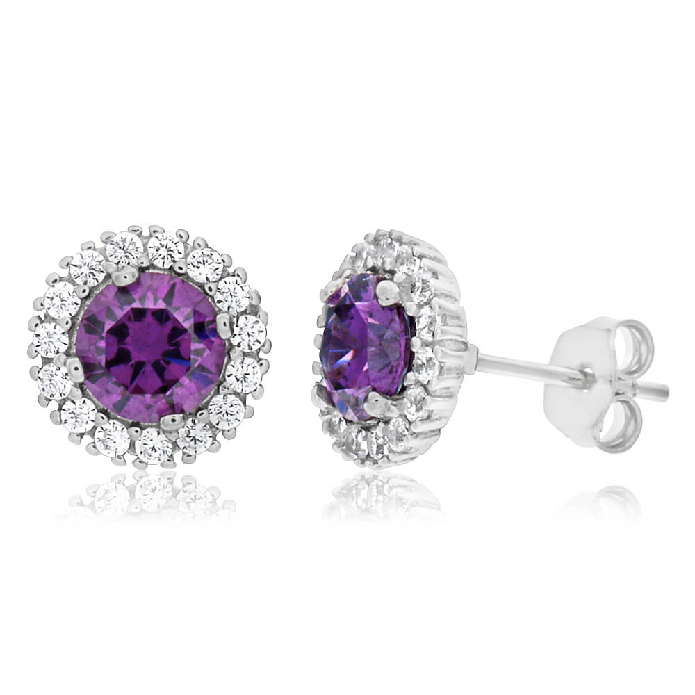Sterling Silver Rhodium Plated Purple Zirconia + White Zirconia Stud Earrings