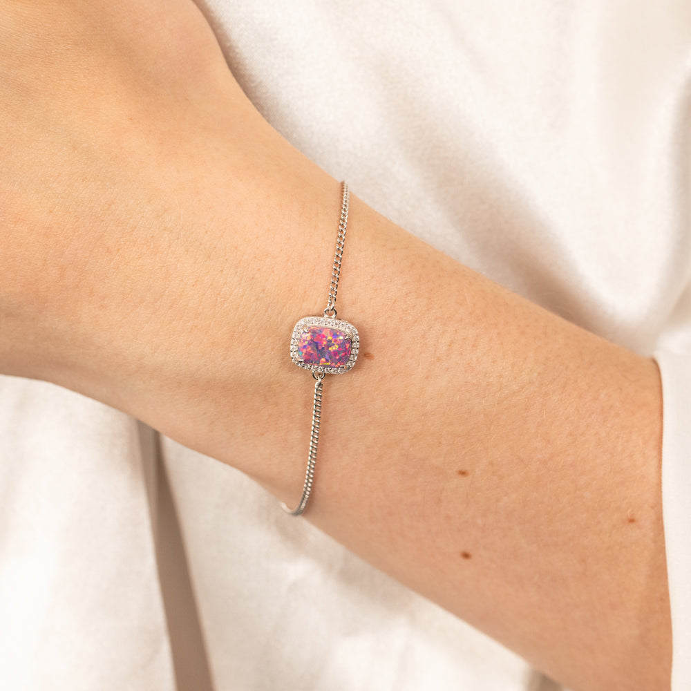 Sterling Silver Rhodium Plated Rectangle Created Purple Opal And White Zirconia 15.5+3cm Bracelet