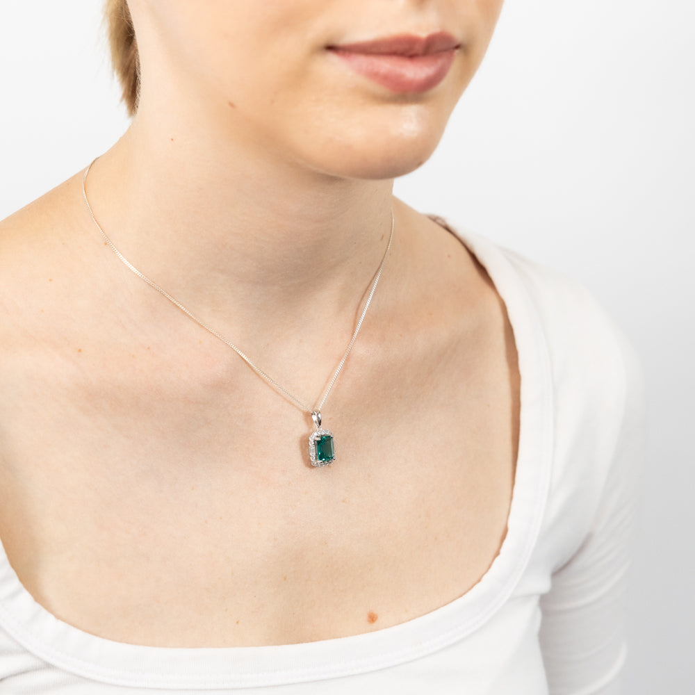 Sterling Silver Rhodium Plated White And Emerald Green Cubic Zirconia Rectangle Pendant
