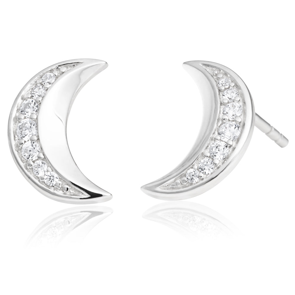 Sterling Silver Rhodium Plated Zirconia Crescent Stud Earrings