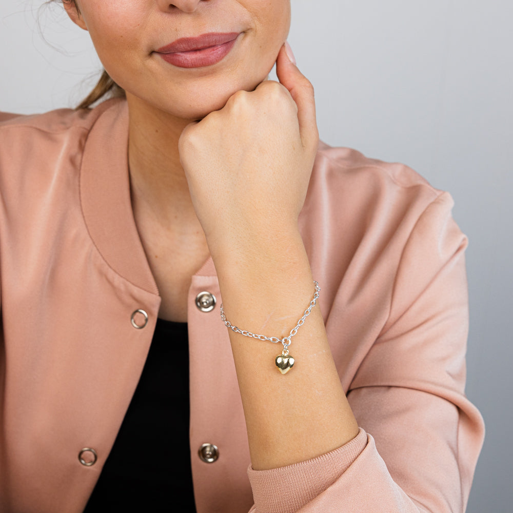 Sterling Silver Two Tone Heart Charm on 17+3cm Bracelet