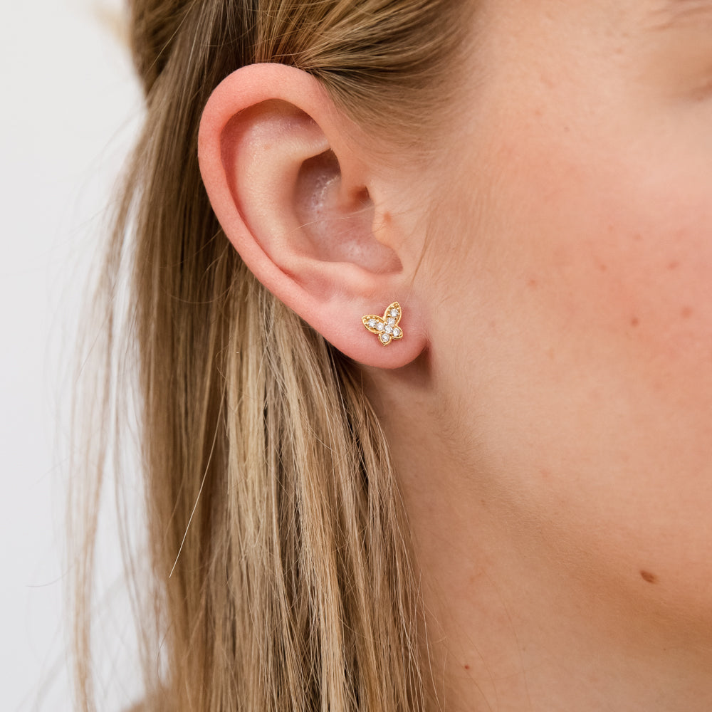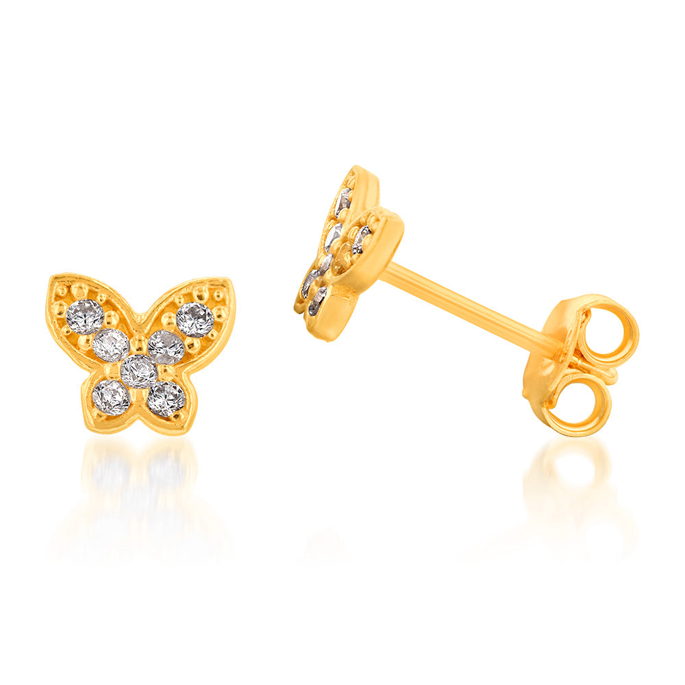 Yellow Gold Plated Sterling Silver Cubic Zirconia On Butterfly On Stud Earrings